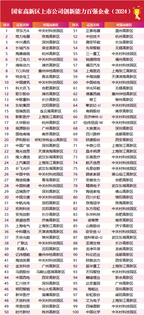 由中国科学院科技战略咨询研究院中国高新区研究中心编写的报告显示,国家高新区上市公司创新能力百强企业呈现出研发投入高、核心技术多、人才结构更优等特点。在研发投入上,国家高新区上市公司创新能力百强企业平均研发投入为42.43亿元,远高于国家高新区上市公司均值4.3亿元。核心技术储备方面,国家高新区上市公司创新能力百强企业平均核心技术储备为4317项,远高于国家高新区上市公司均值425项。