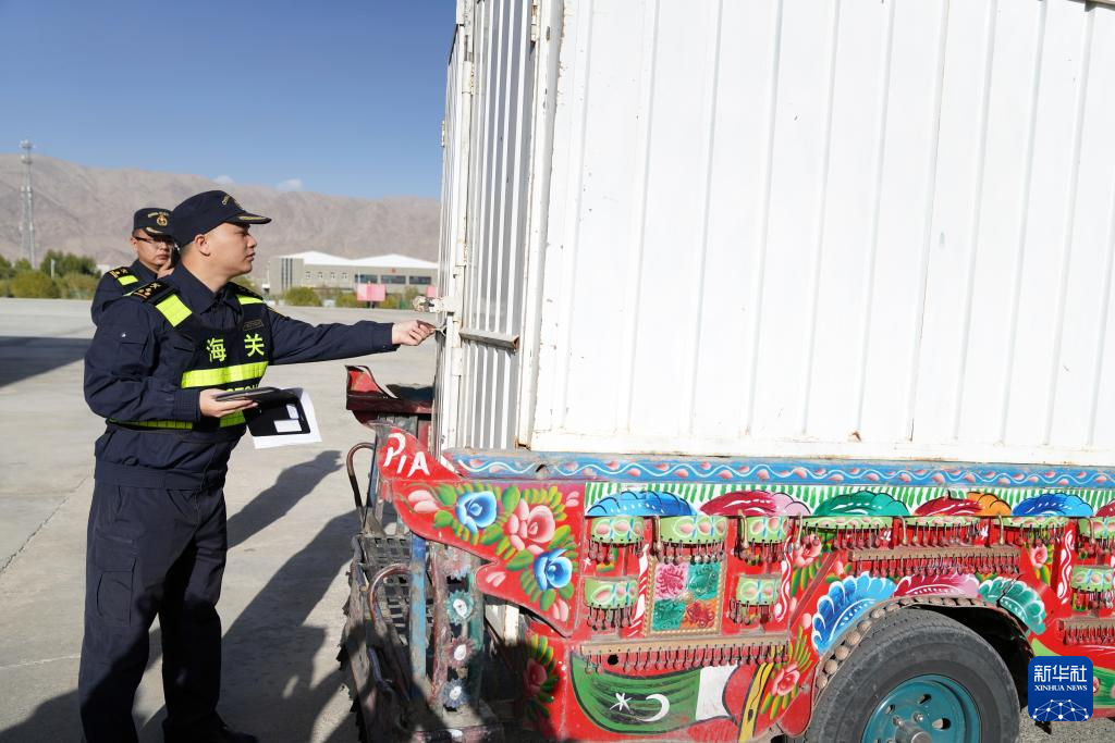 9月23日,新疆出入境边防检查总站红其拉甫边检站民警对出境车辆进行查验。新华社发(依热凡江摄)