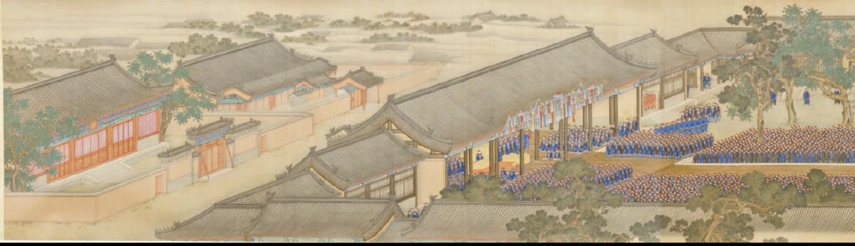 值得一提的是,这次的临雍大典被以绘画的方式记录下来,使得人们能够像观看纪录片一般考察当时的细节。在这幅《胤禛临雍图》中,后人还能一窥乾隆改建前国子监的全貌,而且每一位参与大典的人物,无论是负责周边警戒工作的侍卫,还是听讲的官员,乃至于坐在彝伦堂中的雍正皇帝,都被忠实地记录下来。