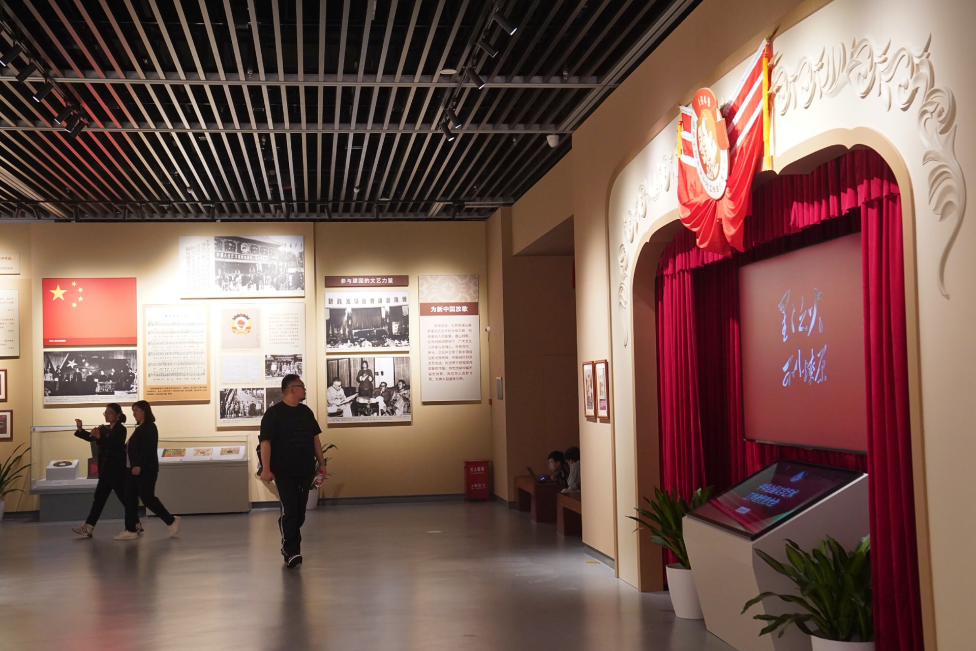 以“文艺”为主题的展览,有声有图也有影。观众可以通过扫码听到多个不同版本的《义勇军进行曲》,包括电影《风云儿女》主题曲版本、二十世纪三四十年代上海百代唱片公司发行并在印度灌制的、美国纽约出版的黑人歌唱家保罗·罗伯逊演唱的等。徐悲鸿巨幅中国画《在世界和平大会上听到南京解放的消息》格外引人瞩目。画作中,100多个人物表情生动各异,或激动相拥,或鼓掌大笑。1949年4月,世界拥护和平大会第一次会议召开,中国共产党应邀派出代表团。会议召开期间,传来南京解放的消息,会场顿时成为欢乐的海洋,著名摄影家石少华用相机记录下这激动人心的一刻。徐悲鸿以此摄影作品为基础,创作了画作。