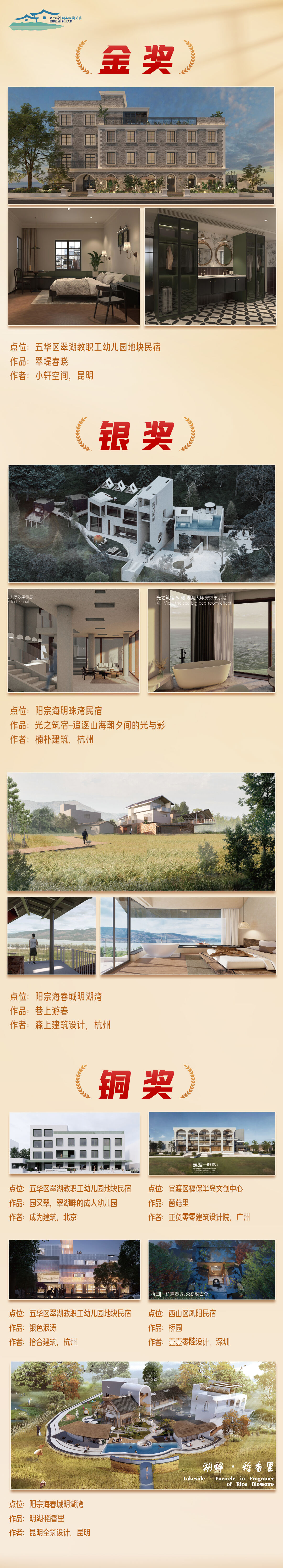 位于阳宗海风景名胜区的设计点位因其秀美的自然风光,也深受选手青睐。利用光影和建筑的关系打造追日出日落胜地的《光之筑宿——追逐山海朝夕间的光与影》,将稻田、湿地、湖泊与建筑巧妙融合的《明湖·稻香里》,无一不让人心生向往。