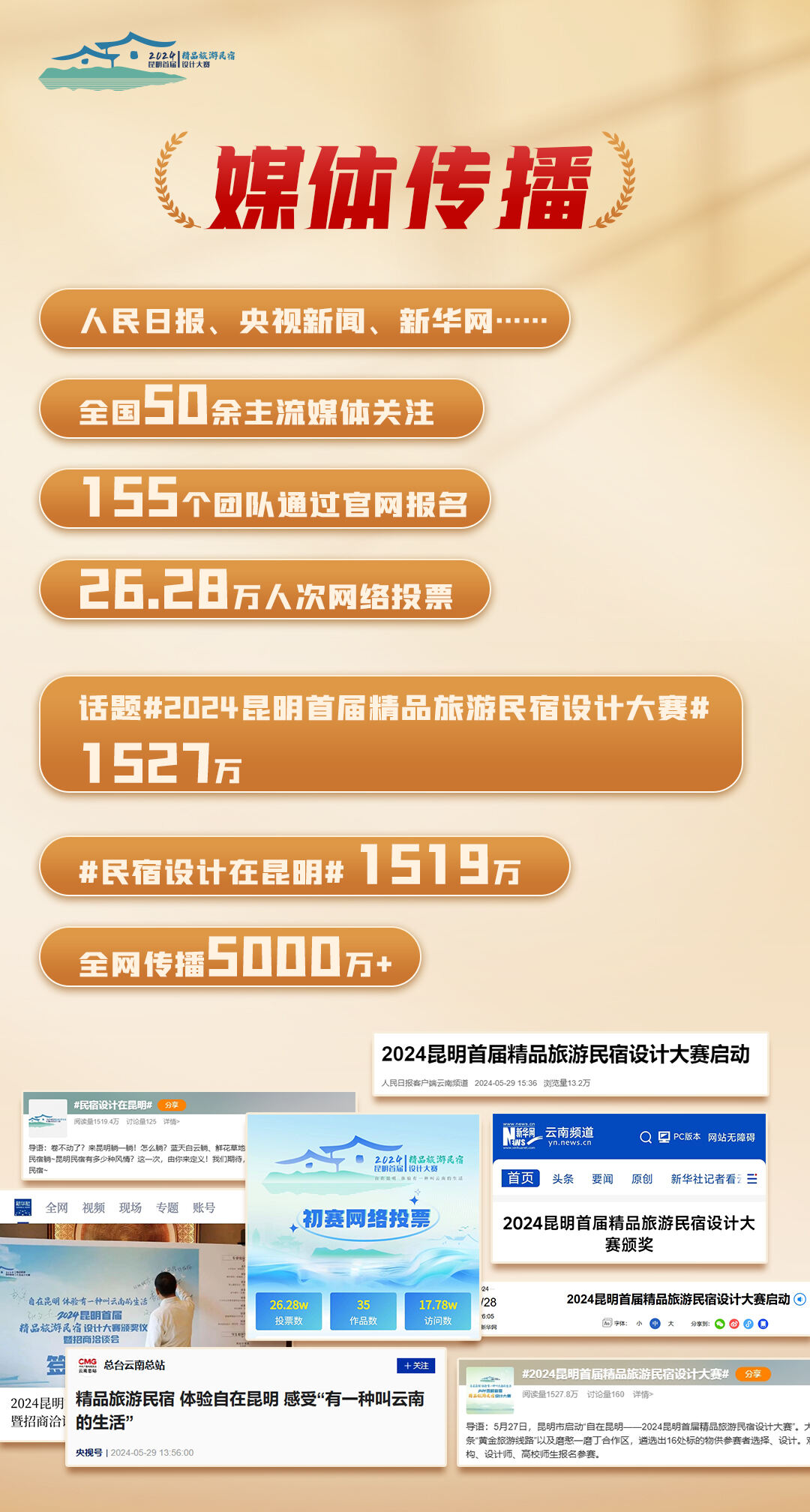 此次设计大赛,受到人民日报、央视新闻、新华网等全国50余家媒体集中报道,在全国范围内得到广泛曝光。视频、图文、专访、直播……赛事持续以各种形式出现在公众眼前,“行业专家看昆明”“设计师看昆明”“民宿设计背后的故事”等一批品牌专访让有关民宿的探讨走向深入,全网话题曝光量5000万+,“民宿”无疑成为今夏昆明的热点话题之一。