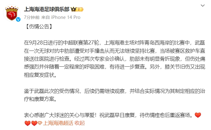 30日,上海海港俱乐部发布队员武磊伤情情况。经复查,武磊肋部没有明显骨折现象,但膝关节旧伤又出现复发症状,这也让武磊参加10月份两场世预赛18强赛的前景蒙上了阴影。