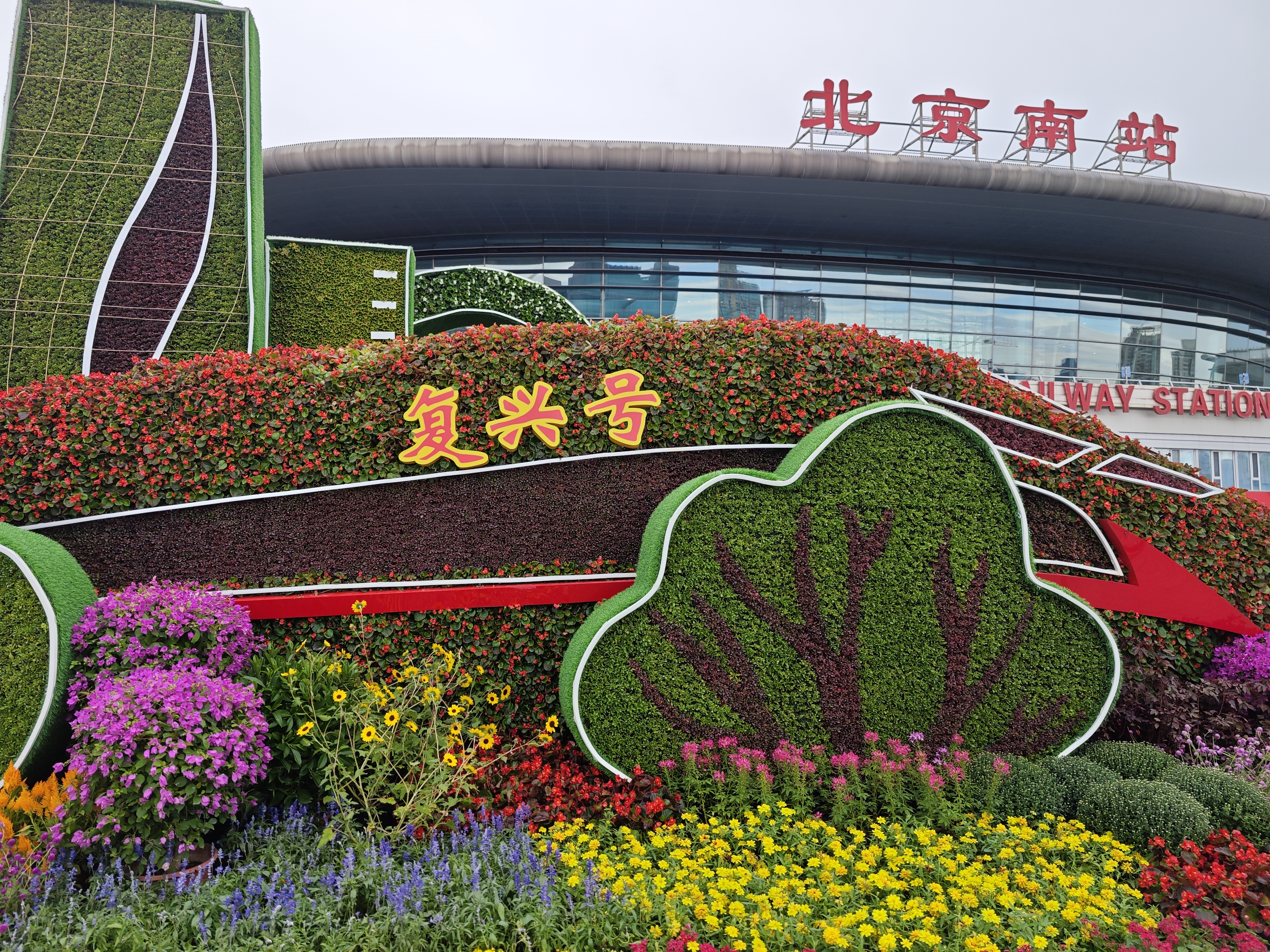 北京市重点站区管委会相关负责人介绍,北京南站地区国庆花坛以“伟大复兴”为主题,用丽泽商务区建筑剪影和复兴号高铁为花坛主景,浓缩和歌颂了我国在高铁建设中取得的伟大成就。