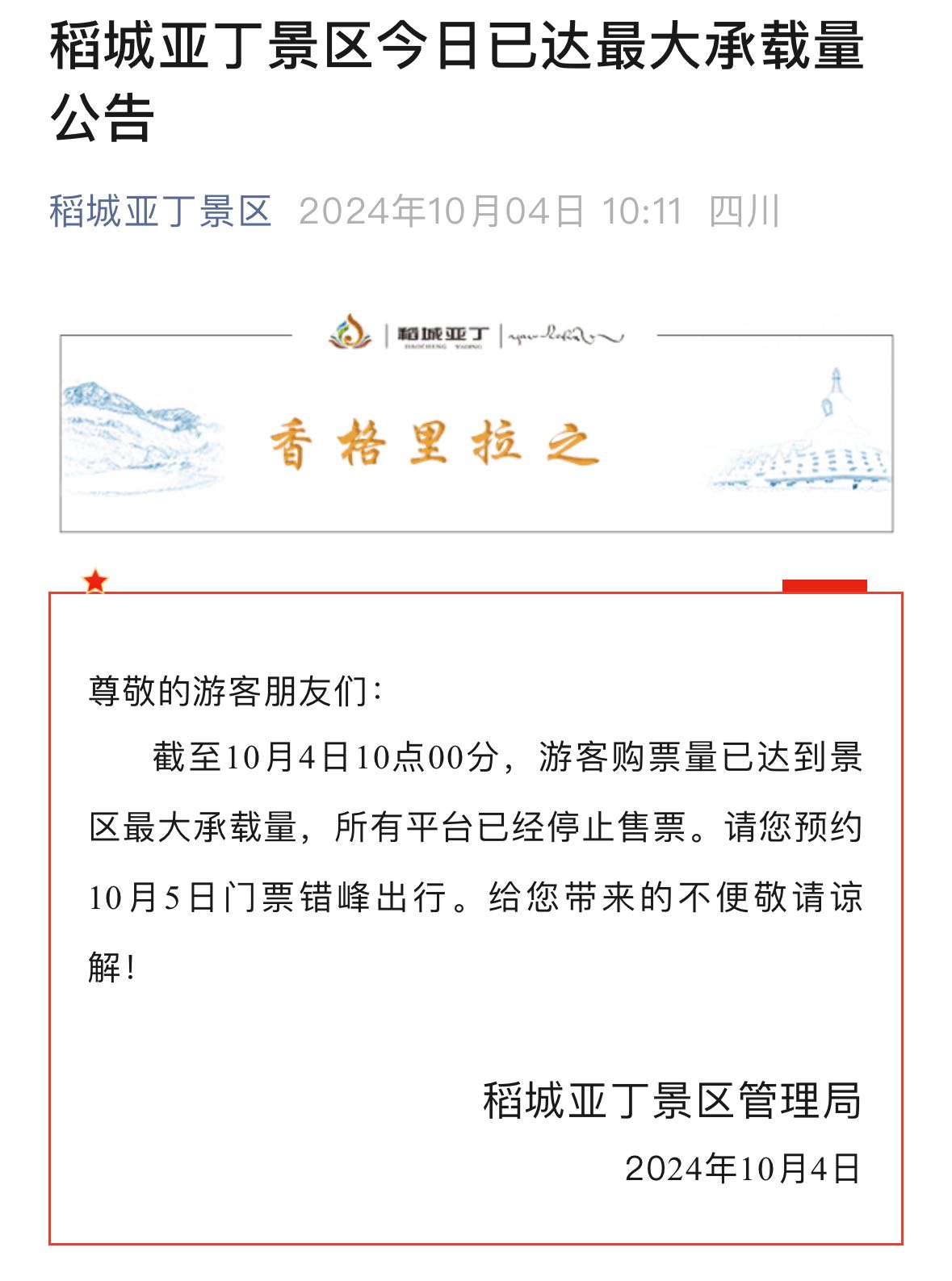 四川“稻城亚丁”景区管理局微信公众号10月4日发文,截至4日10点00分,游客购票量已达到景区最大承载量,所有平台已经停止售票。请预约10月5日的门票错峰出行。