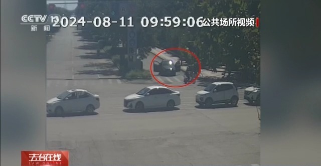 在湖北荆州监利市的一处视频记录中,蓝色圆圈里的是推着自行车的刘某,此时,她扶着自行车滑了两步,蹬上了车。这时,红色圆圈内的朱某骑着电瓶车从刘某的右侧驶过,然而在这个过程中,意外发生了。
