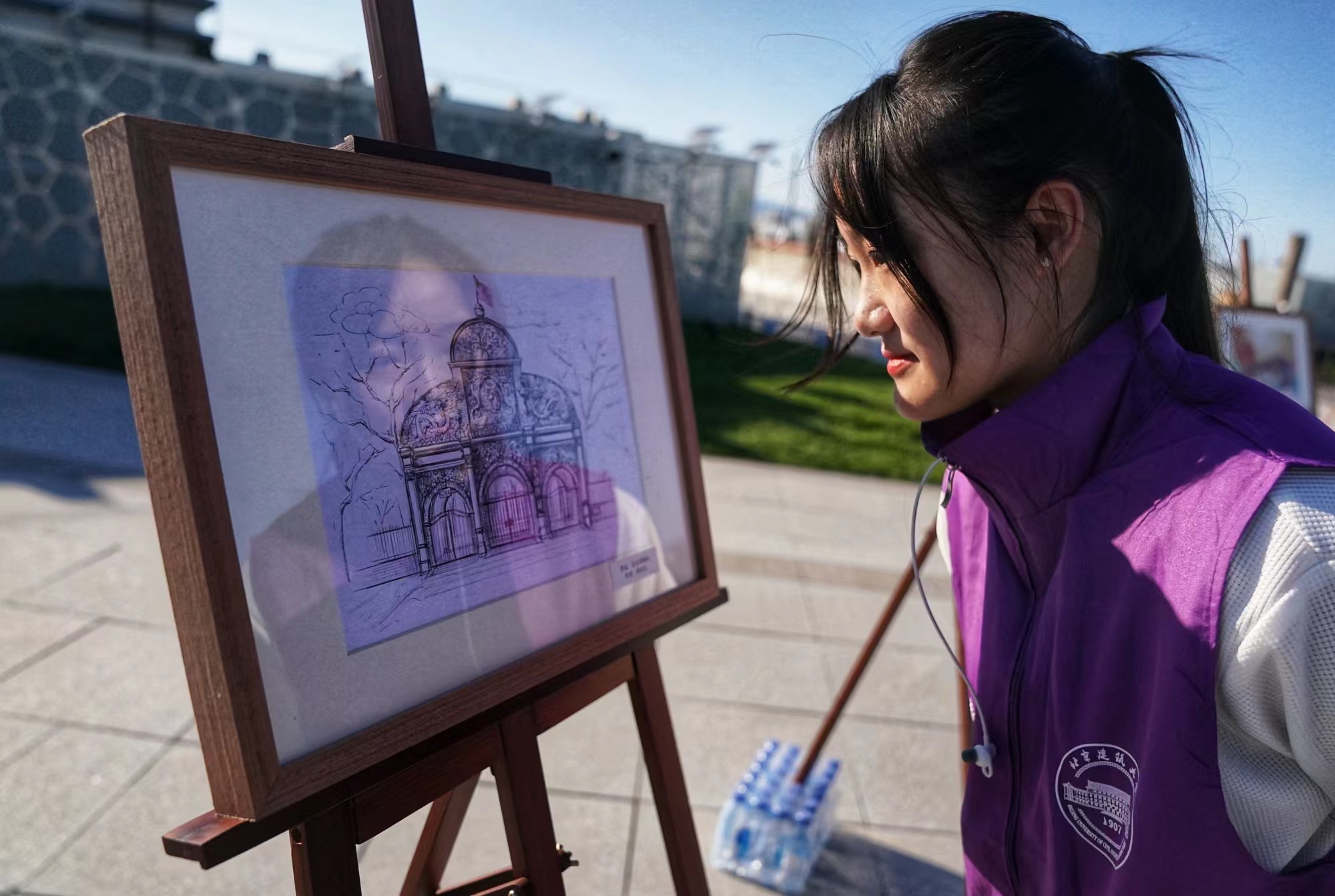 在顶楼星空花园,建筑绘画作品展又为观众带来了一场视觉盛宴。展览由北京建筑大学24位本硕学生共同完成,以手绘和板绘的形式,描摹出“首建典藏地”4条线路共28个建筑点位,运用生动的色彩和细腻的笔触,描绘时代光彩,带大家领略建筑的故事与魅力。