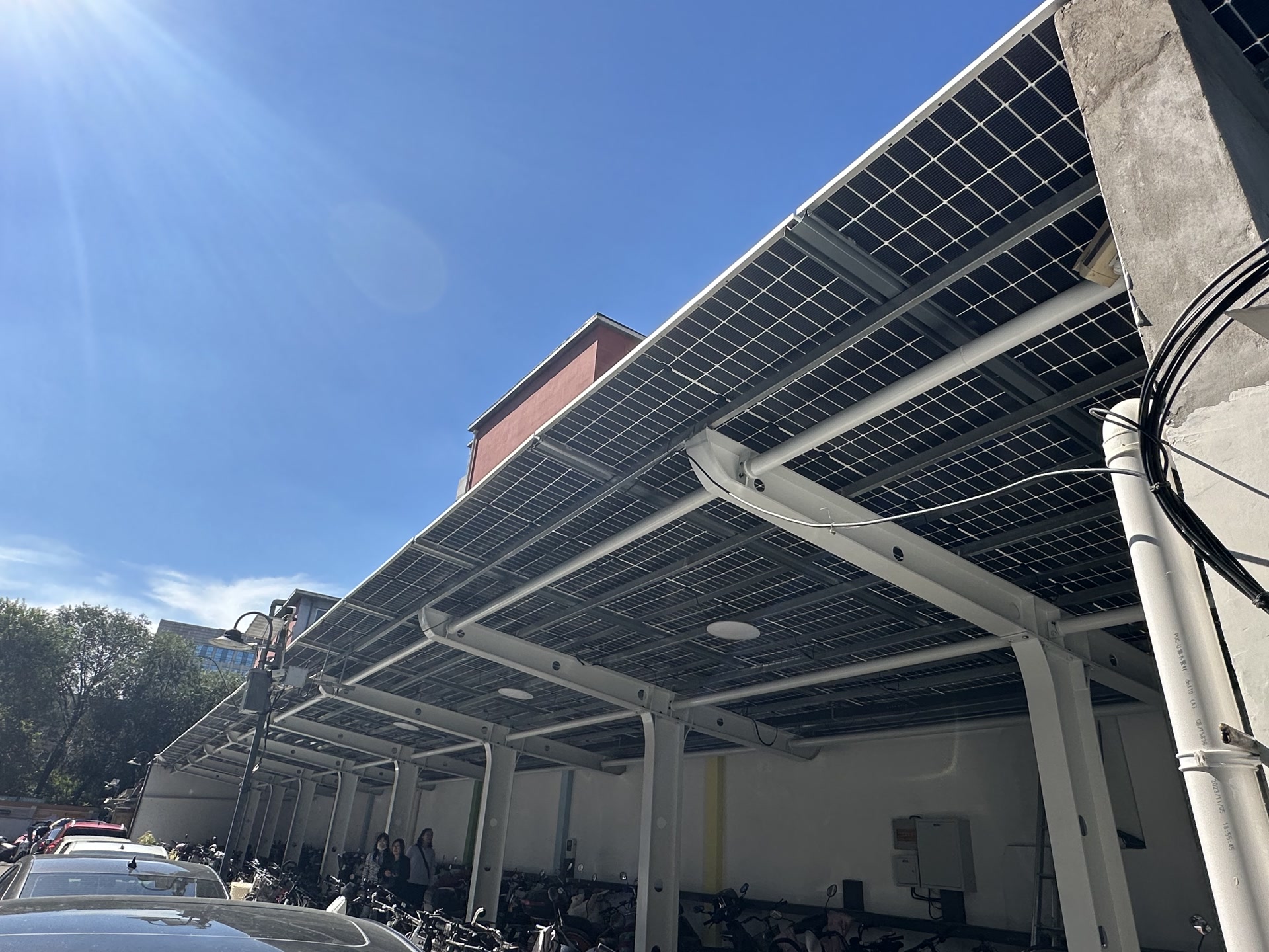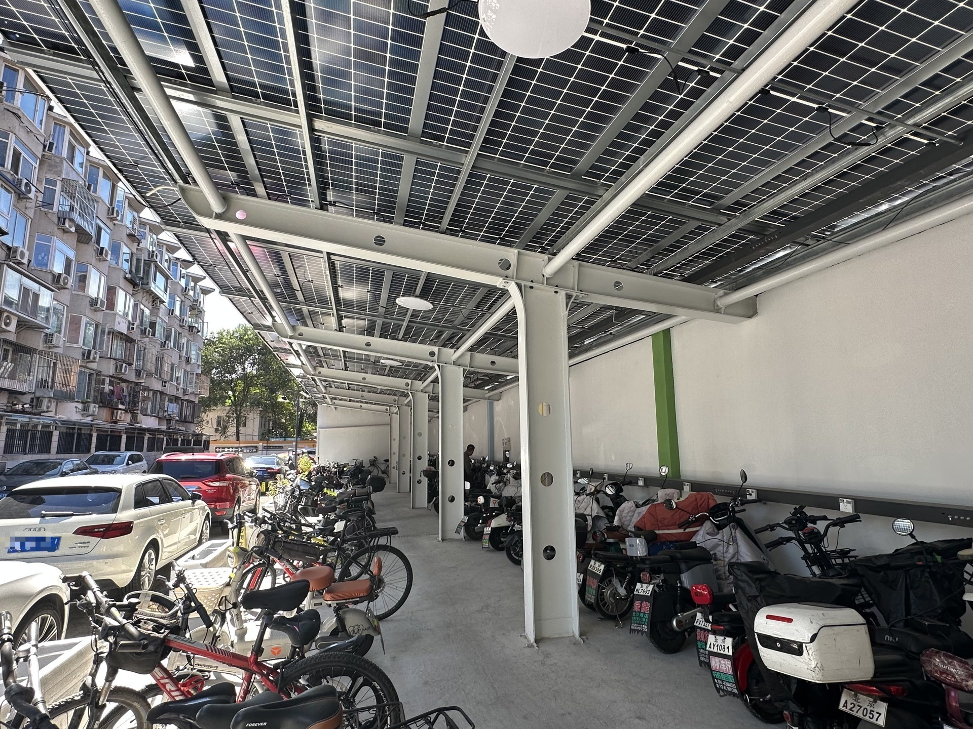 这处约230平方米的车棚,棚顶是由72块光伏板组成的。“这些光伏板叫单晶硅双玻光伏组件,在白天光照充足时,通过吸收太阳能可以自主发电,为白天充电的电动车供电。”北京低碳智慧城市科技有限公司华北经理部总经理苟堂介绍。在车棚的一角,放置着一个金属柜,里边放置着配电设备和多块固态储能电池。“白天用不完的电,可以储存到这个设备里,在夜间为电动车充电和用于车棚照明。此外,我们的设备也同步接入了国家电网,在光伏发电和车棚用电不匹配的情况下,智能化的柔性能源管理平台可实现光伏、储能和电网供电之间的灵活调节。”苟堂说。