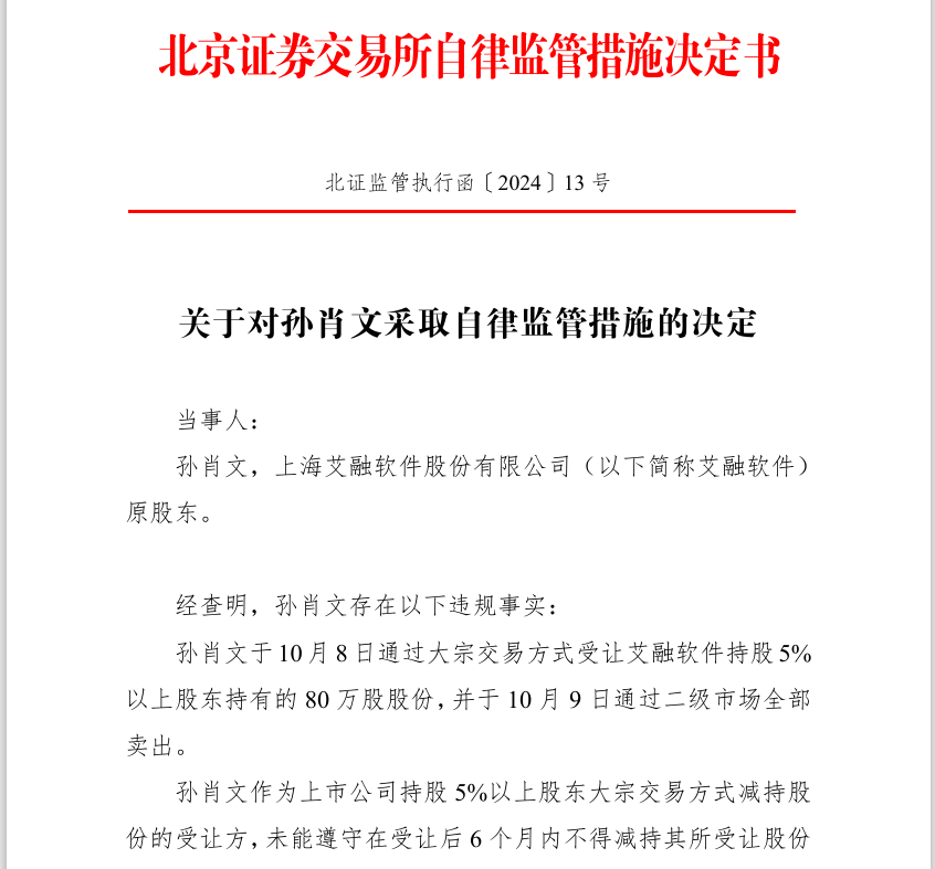 孙肖文于10月8日通过大宗交易方式受让艾融软件持股5%以上股东持有的80万股股份,并于10月9日通过二级市场全部卖出。