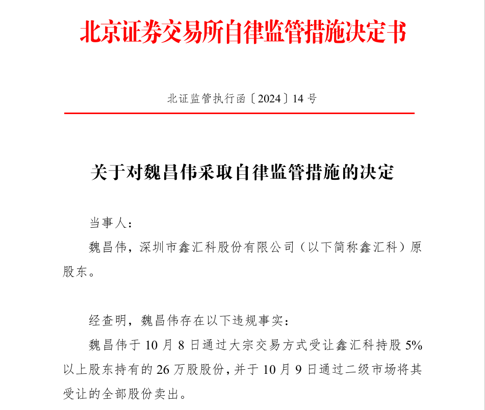 魏昌伟于10月8日通过大宗交易方式受让鑫汇科持股5%以上股东持有的26万股股份,并于10月9日通过二级市场将其受让的全部股份卖出。