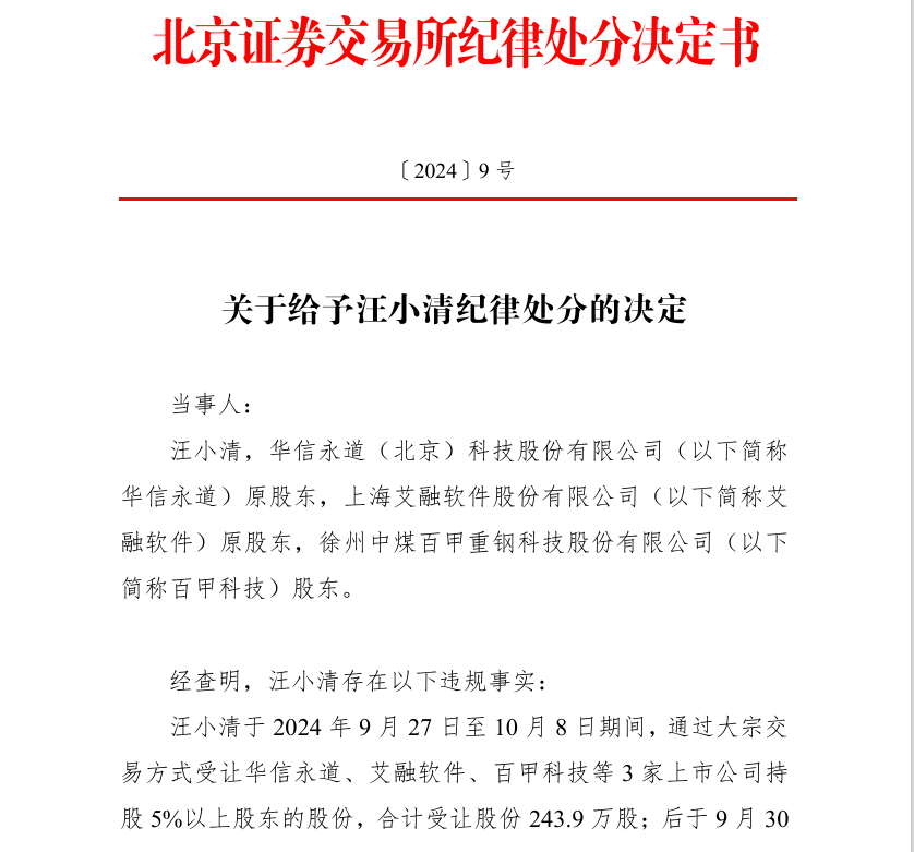北交所依规对魏昌伟、孙肖文采取出具警示函的自律监管措施,给予汪小清公开谴责的纪律处分,并采取限制证券账户交易 6 个月的自律监管措施,限制证券账户交易期自2024年10月11日至2025年4月10日,且记入证券期货市场诚信档案。