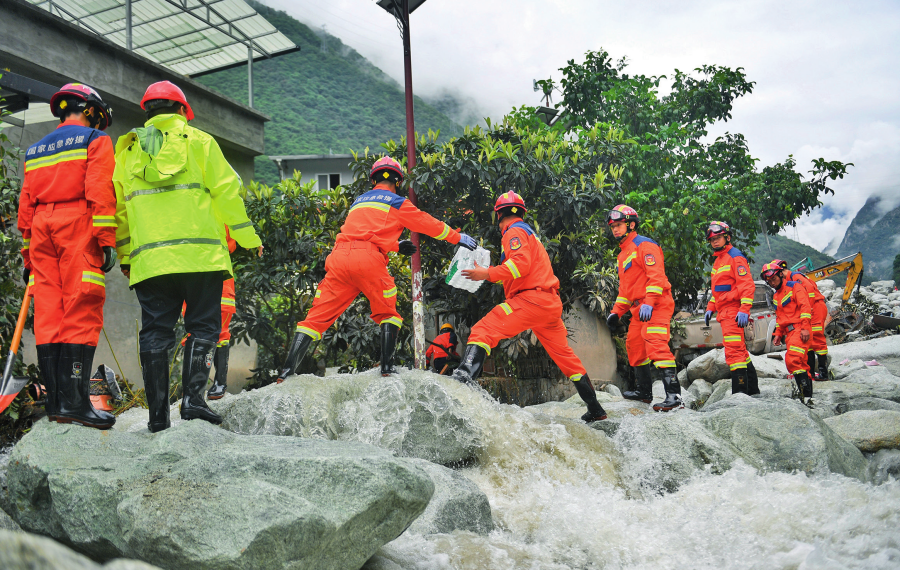 在四川省康定市日地村,救援人员涉着山洪传送物资(2024 年 8 月 5 日摄) 刘坤摄 / 本刊