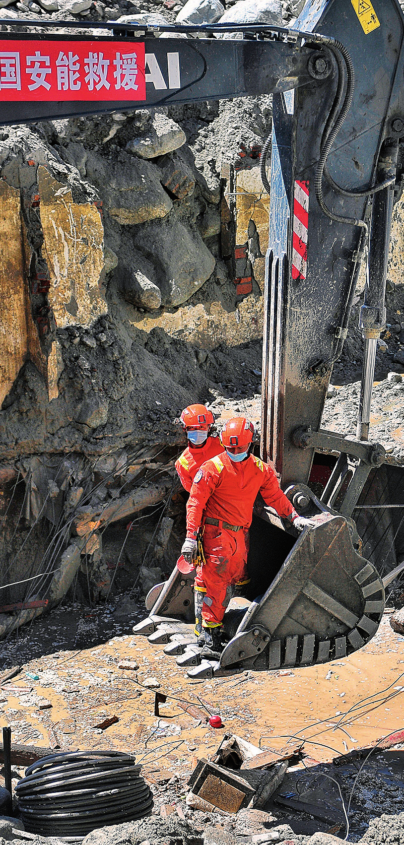 救援人员在四川省康定市日地村一处被 泥 石 流 掩 埋 的 建筑 内 搜 救 失 联 人 员(2024 年 8 月 5 日摄)刘坤摄 / 本刊