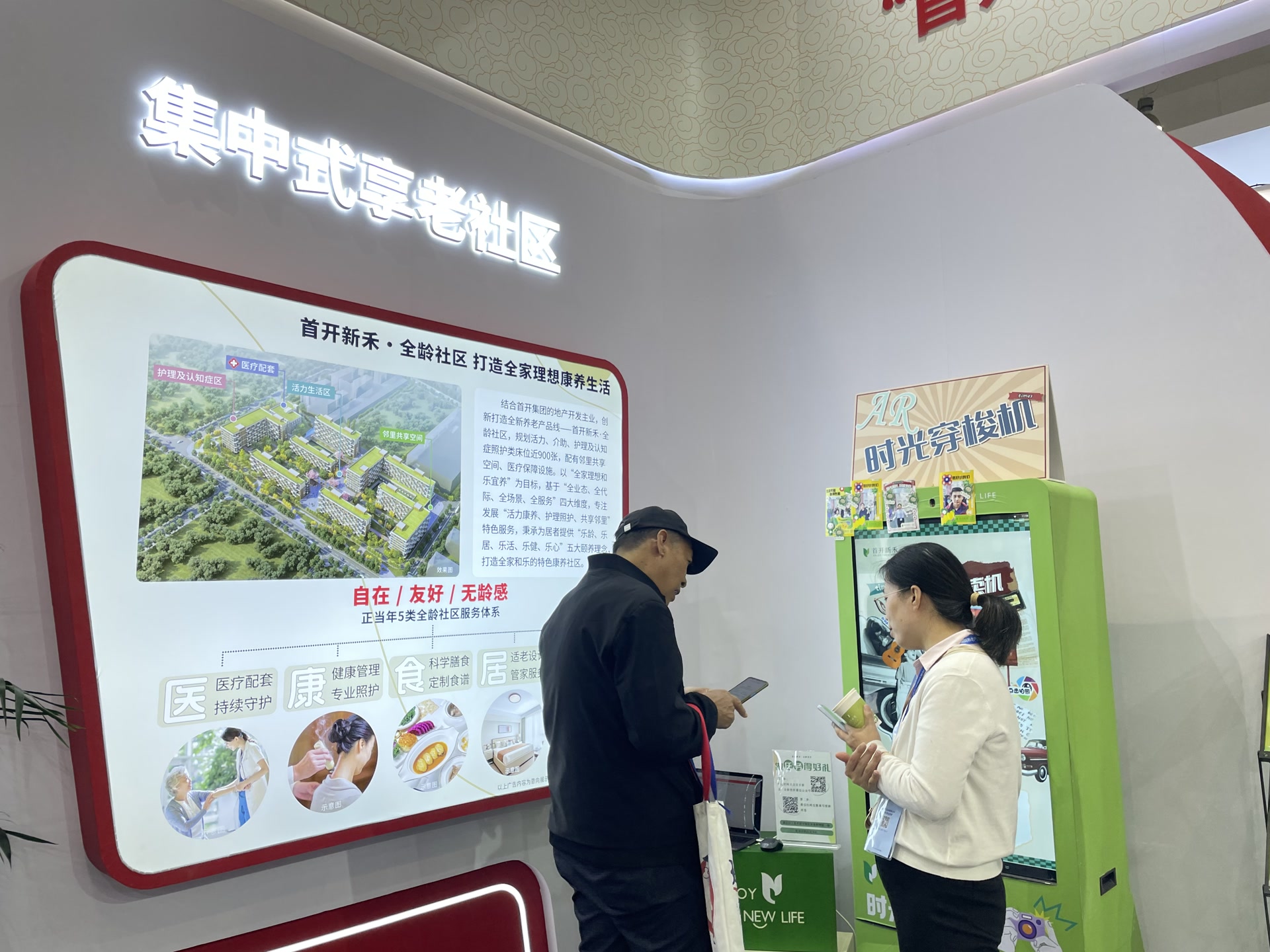 沿着时间线,在集中式享老社区区域展示了首开新禾·全龄社区项目。首开集团结合地产开发主业,规划活力、介助、护理及认知症照护类床位近900张,配有邻里共享空间、医疗保障设施。以“全家理想 和乐宜养”为目标,基于“全业态、全代际、全场景、全服务”四大维度,专注发展“活力康养、护理照护、共享邻里”特色服务,秉承为居者提供“乐龄、乐居、乐活、乐健、乐心”五大颐养理念,倾心倾力守护长者的幸福,打造全家和乐的特色康养社区。该项目位于顺义区高丽营镇,目前处于建设阶段,将于近期推出。展会期间特设置了“AR时光穿梭机”互动设备,让您一秒拍照穿梭,定格到自己理想的年龄时光,冲洗带走属于自己的时光刻印。