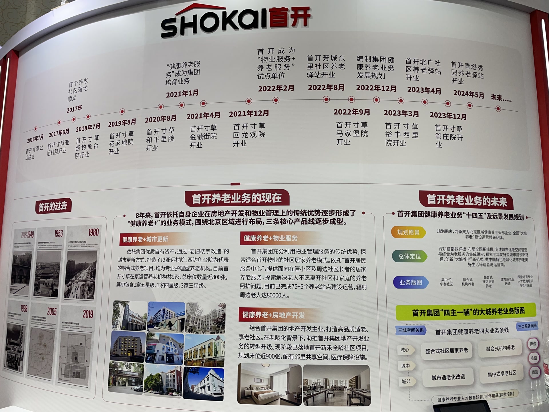 坚守“城市复兴官”的战略定位,首开集团从2015年开始,围绕存量资源和转型发展,聚焦建成区的高质量发展,积极补齐健康养老服务短板。本次展会上,首开集团的展台设计以时间为轴,依次列举了首开集团进入养老行业的重要时间节点,并进行详细介绍。在首开集团总体业务介绍板块,通过“首开的过去”“首开养老业务的现在”及“首开养老业务的未来”予以展现。其中“首开的过去”,以6张老照片形式的海报呈现首开集团70年发展史。“首开养老业务的现在”介绍了目前已形成的“健康养老+”三条业务线的模式。“首开养老业务的未来”着重介绍首开集团健康养老业务规划,以现有“健康养老+”业务模式为基础,逐步形成以“融合式机构养老”“整合式社区居家养老”“集中式享老社区”“城市适老化改造”为主,以“健康养老专业人才教育培训”为辅的“四主一辅”的业务格局。