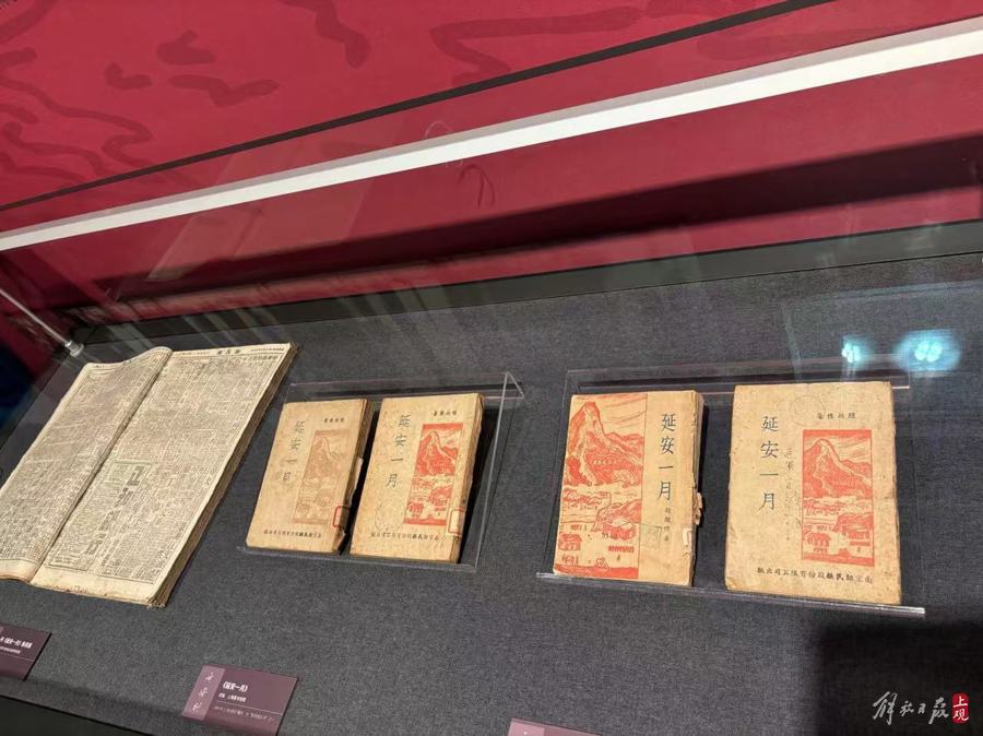 左起:1944年首发连载《延安一月》的重庆新民报,1944年—1945年重庆初版、再版、成都印再版、重庆三版《延安一月》,均为首次公开展出。李天扬 摄