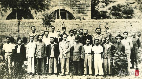 1944年,毛泽东、朱德、周恩来等与中外记者合影,朱德后面为赵超构。