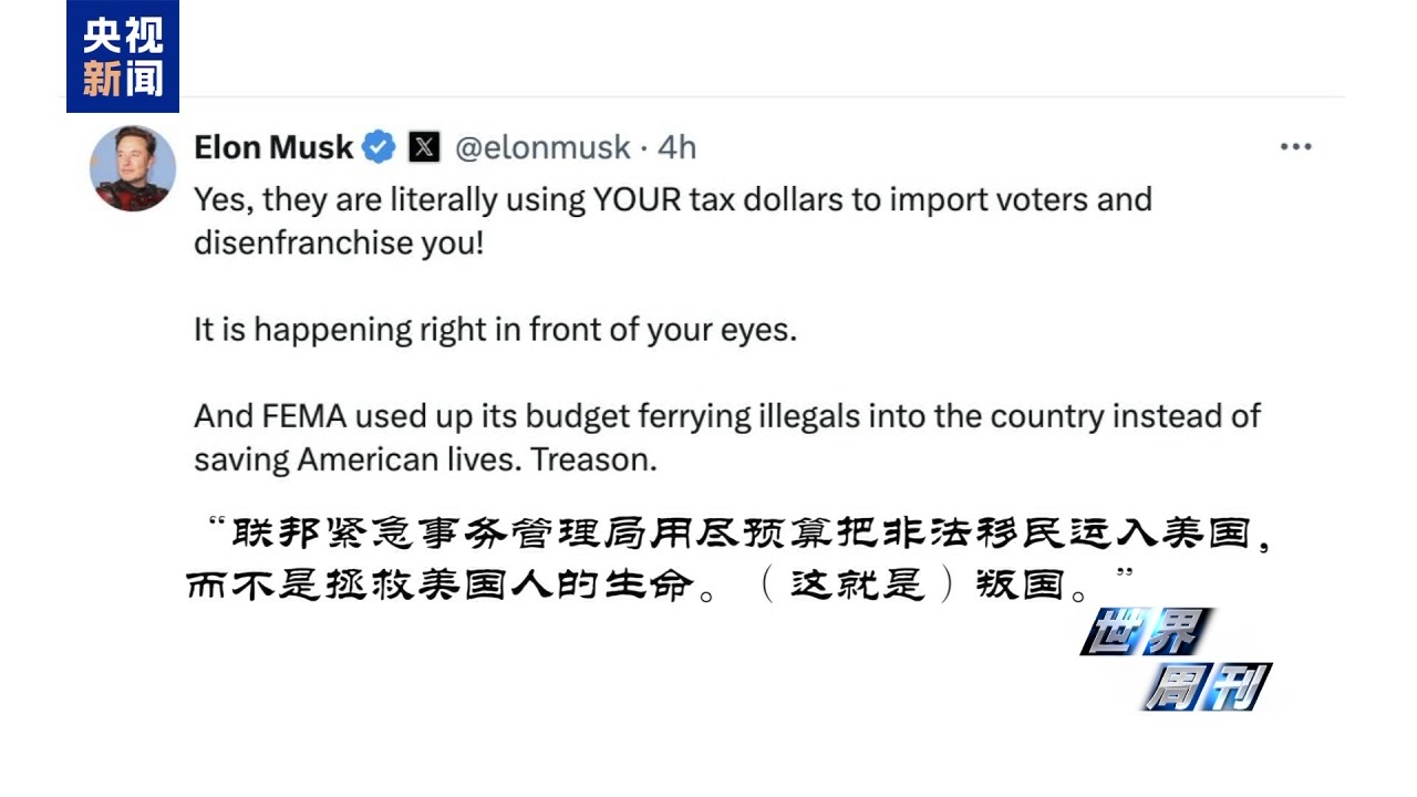 公开支持特朗普的马斯克也在社交媒体X平台发帖称:“联邦紧急事务管理局用尽预算把非法移民运入美国,而不是拯救美国人的生命。这就是叛国。”