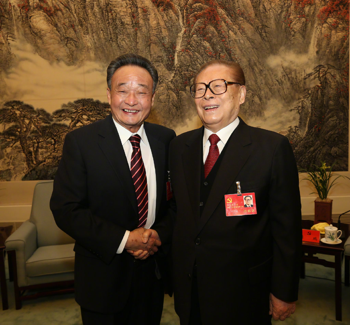 2012年11月14日,中国共产党第十八次全国代表大会在北京闭幕。这是闭幕会前,江泽民同志与吴邦国同志在一起。新华社记者 兰红光 摄