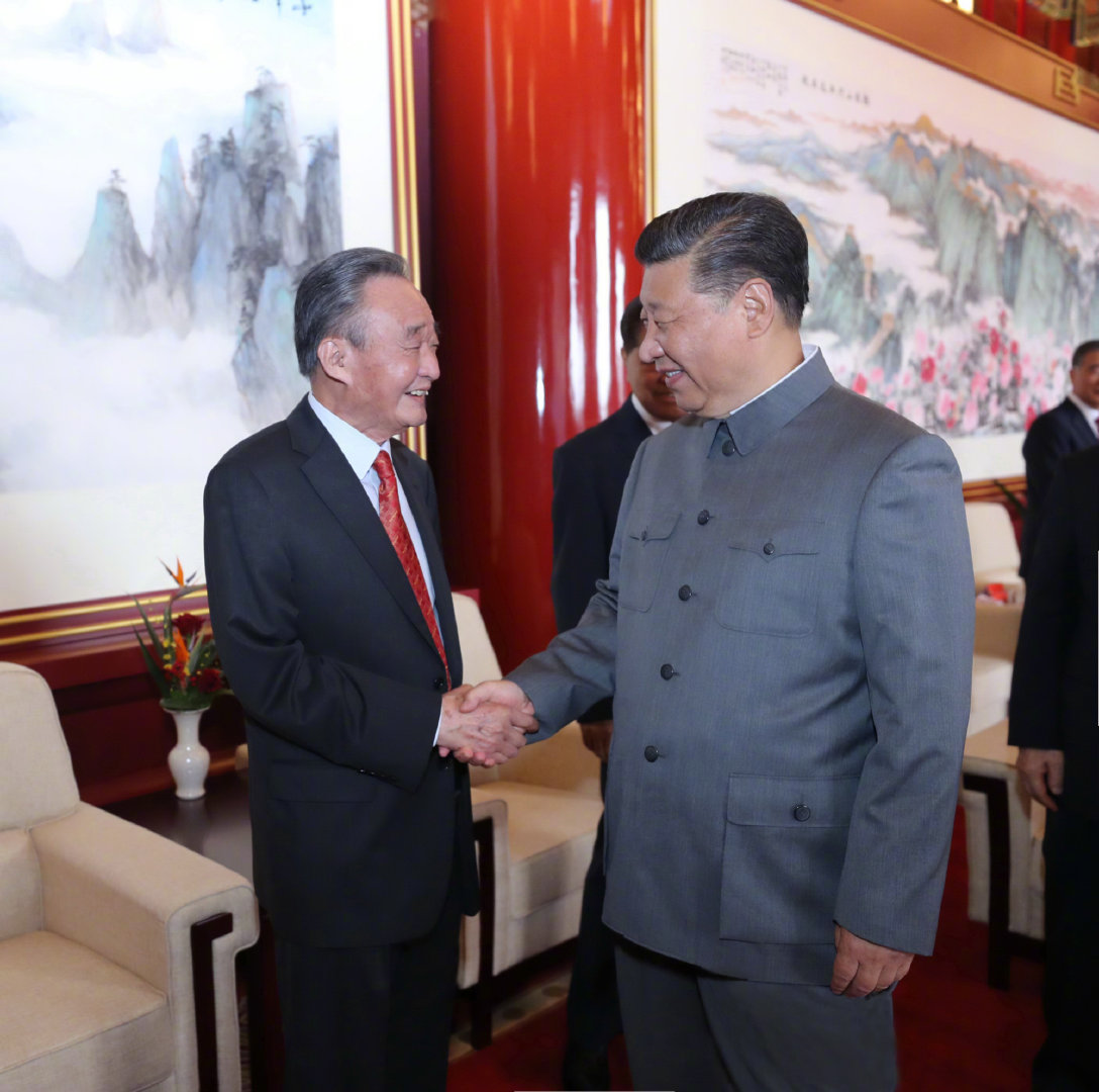 2021年7月1日,庆祝中国共产党成立100周年大会在北京天安门广场隆重举行。这是庆祝大会前,习近平同志与吴邦国同志握手。新华社记者 鞠鹏 摄