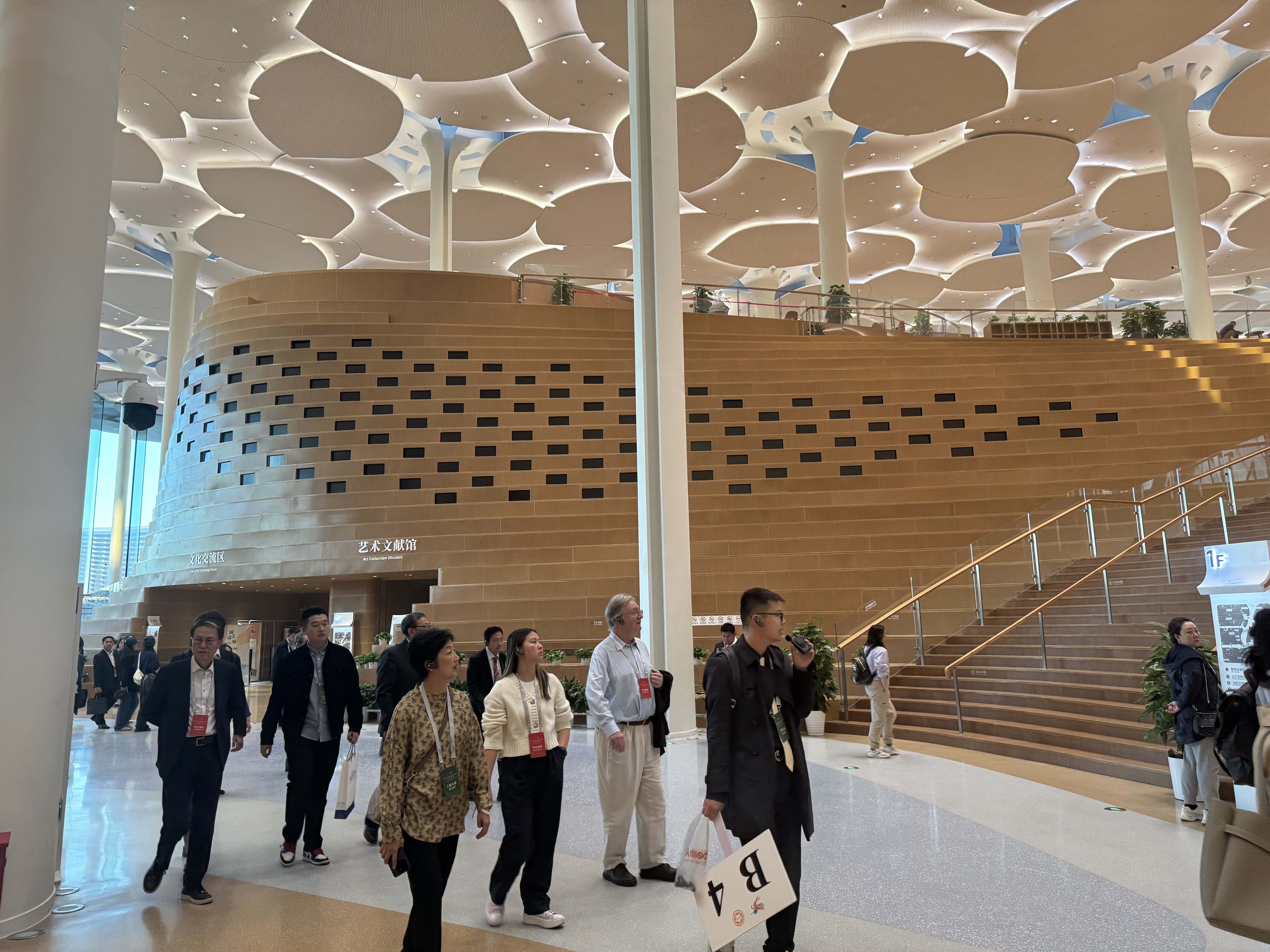 北京城市图书馆,以16米玻璃幕墙为衣、144根银杏造型立柱为梁,馆内两座“书山”起伏绵延、视觉震撼。国际友人步入其中,纷纷拿起手机拍照。