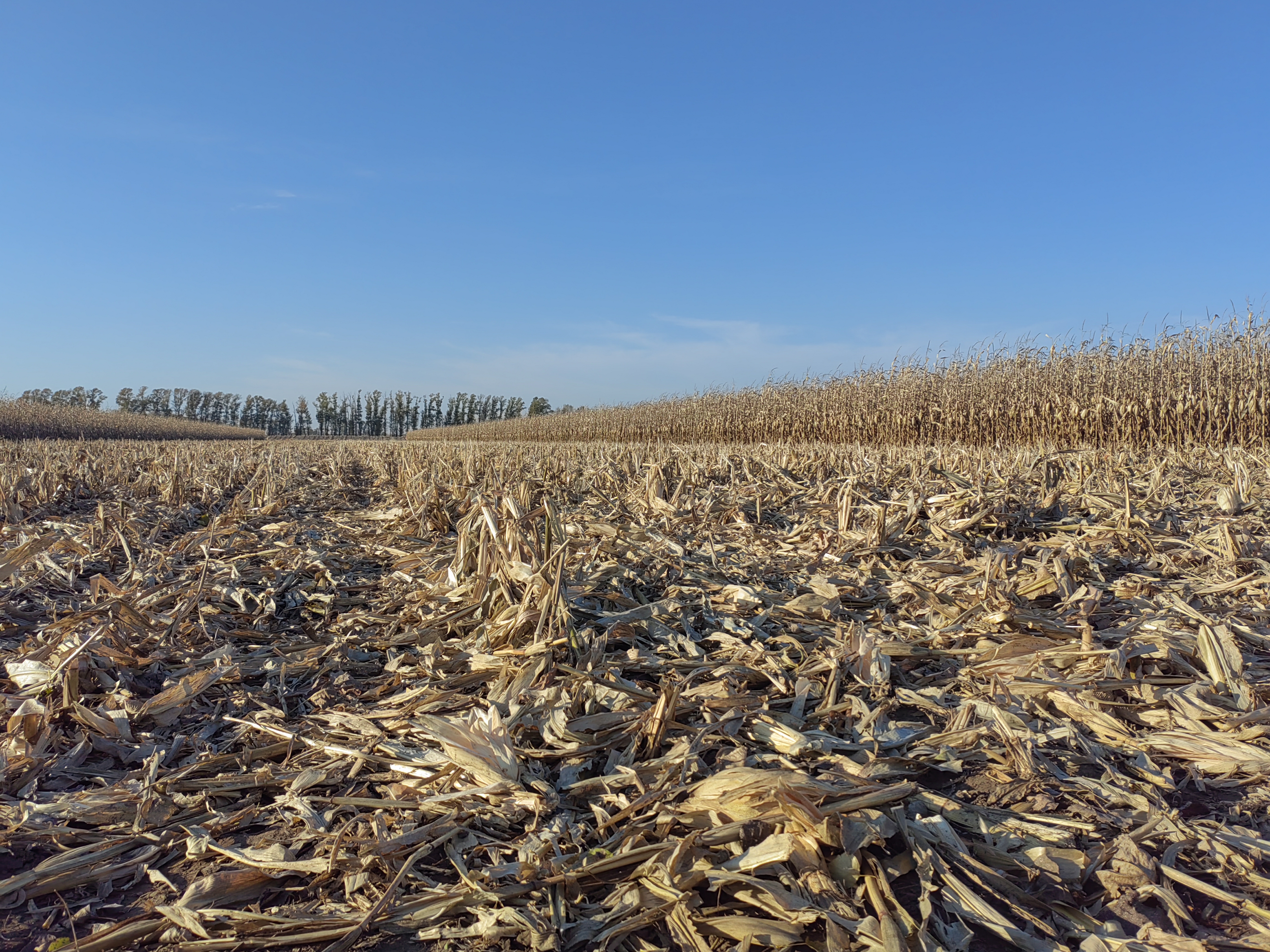 正值东北黑土地秋收时节,收割后的玉米地铺满了金黄的秸秆。