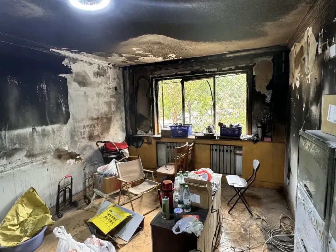 火灾过后,楼道里弥漫着焦糊味,白大爷家中更是一片狼藉,客厅家具过火后尽毁,墙壁和天花板被烟熏得黢黑。