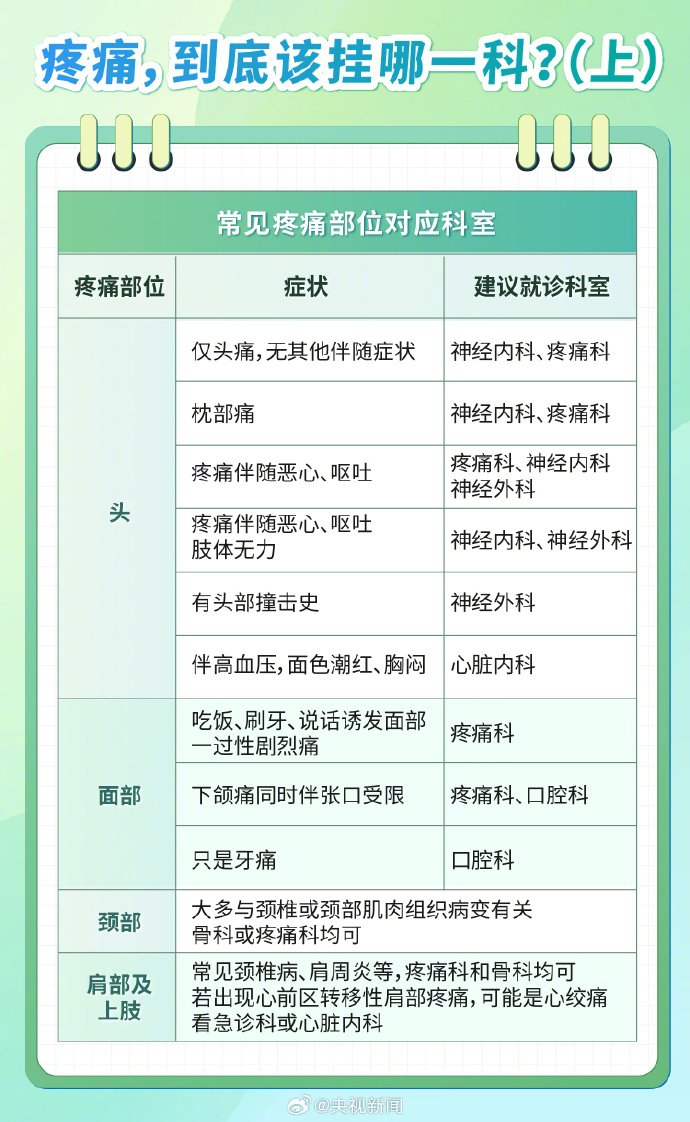 临床上通常把疼痛分为轻度、中度、重度、极重度。其中,极重度疼痛多见于带状疱疹后神经痛、三叉神经痛及癌痛。盲目忍痛容易把小病拖成大病,甚至对疼痛的忍耐力越来越低。身体不同部位发生疼痛,就诊时应该挂哪个科室的号?如何准确向医生描述疼痛?