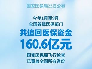 国家医保局飞行检查已覆盖全国所有省份,今年1月至9月,全国各级医保部门共追回医保资金160.6亿元。详情>>