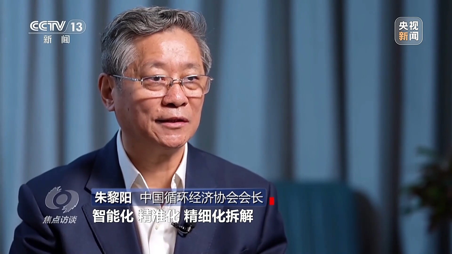 中国循环经济协会会长 朱黎阳:换旧的消费品,能用的物尽其用,不能用的废旧物品进入正规回收渠道,再分拣到专业化的拆解企业。做到从回收端到拆解企业智能化、精准化、精细化拆解和大规模的资源化利用水平越来越高,从某方面来讲,也是对全面实施资源节约战略,提高资源利用效率发挥了重要作用。
