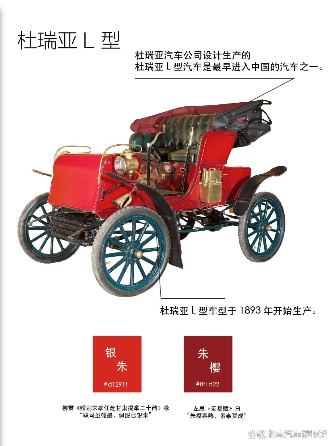 藏品车简介:杜瑞亚汽车公司是美国创建最早的汽车公司之一。该公司设计生产的杜瑞亚L型汽车是最早进入中国的汽车之一。该车型于1893年开始生产。由于使用手工生产的方式,所以产量非常有限,在1903年仅生产了47辆。本馆展示的这辆杜瑞亚 L 型汽车为1903年产原装汽车,在1962年修复后被美国汽车协会(AACA) 授予First Junior奖,2006年获得Senior奖。