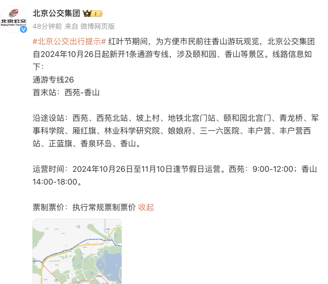为方便市民前往香山游玩观览