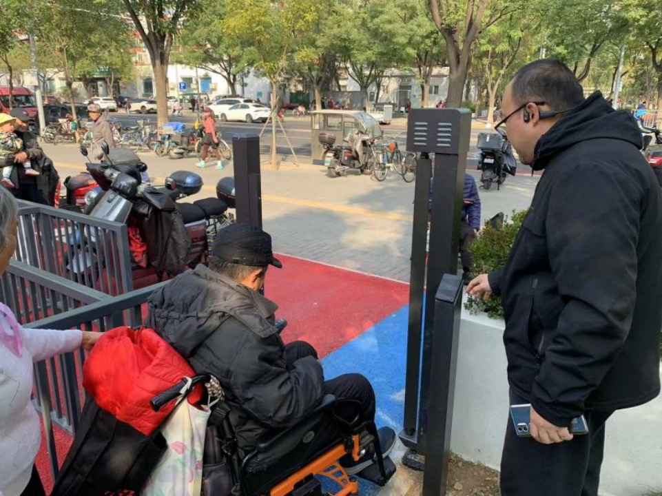 现场,随行的城管办、石榴园南里第一社区等工作人员进行了意见征集、研判设计,最终确定在目前的U形门侧增设无障碍电子门。