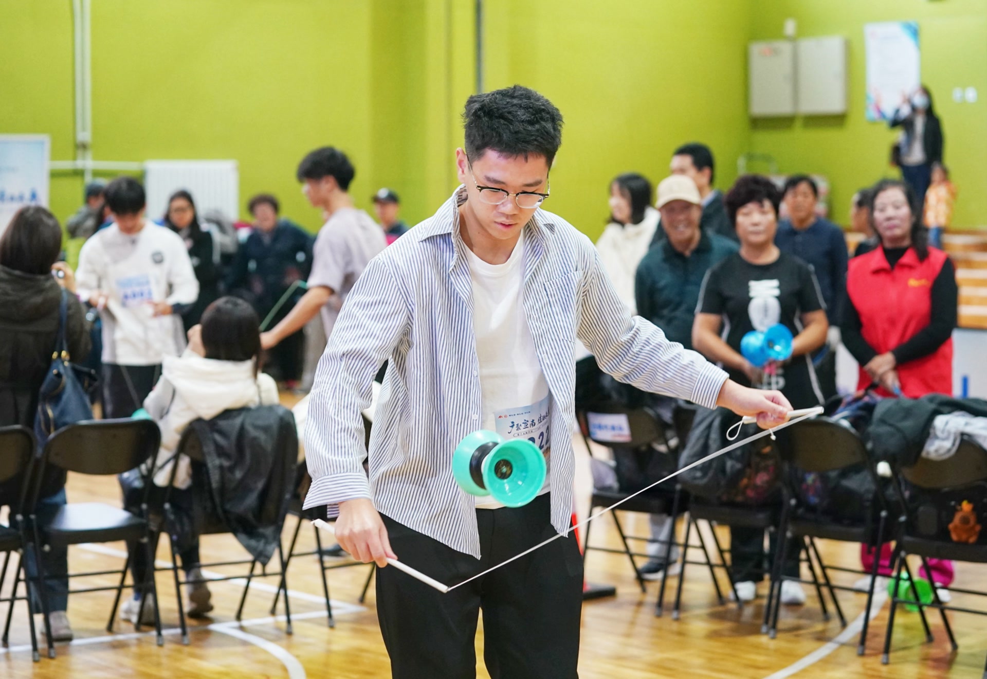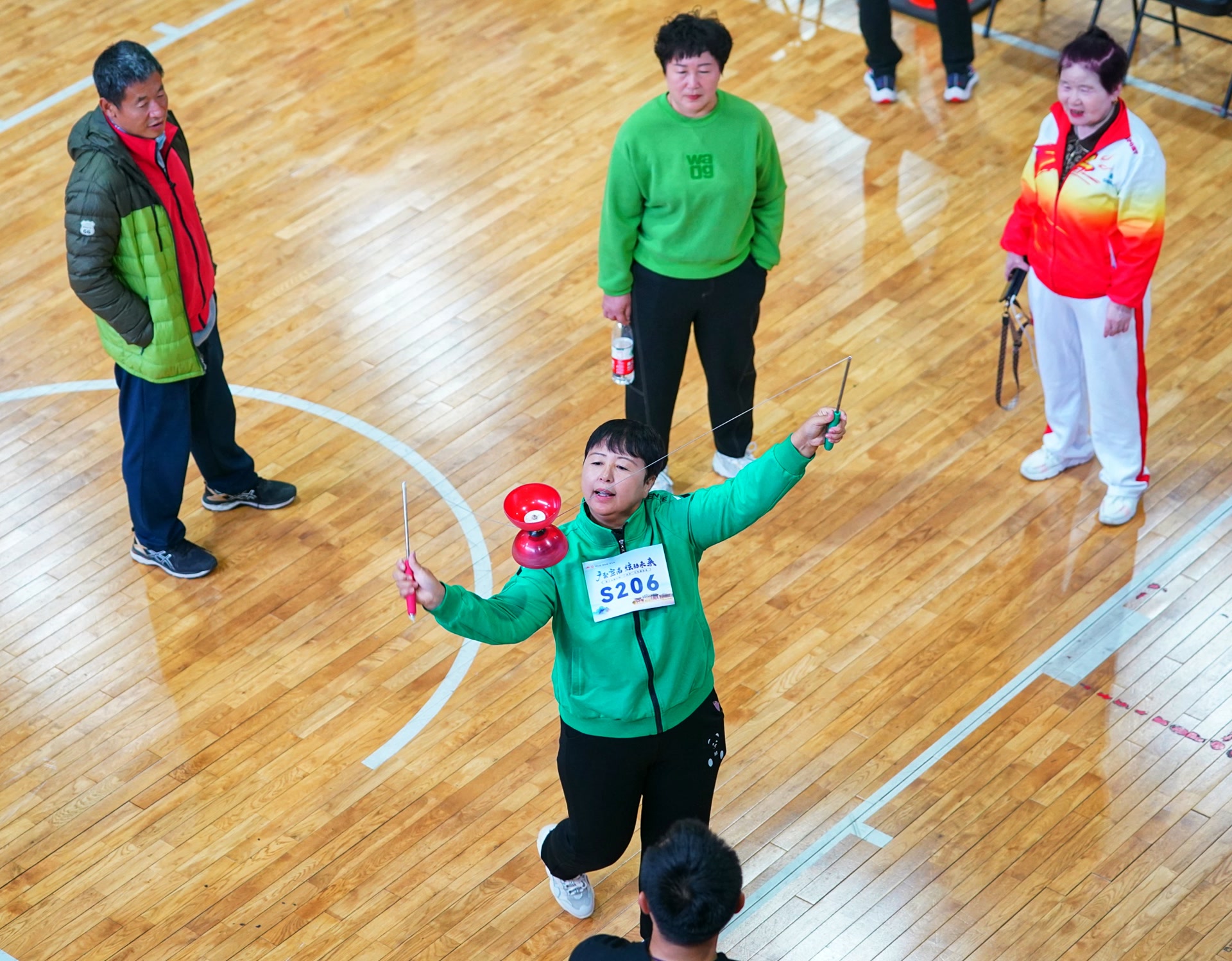 比赛还设置了绝活秀环节,空竹协会的老师们在台上各显其能。空竹不停地在腰间舞动,高难度技巧赢得阵阵掌声。随后登场的男女集体空竹舞将柔美与力量完美融合,长杆、软杆、大空竹……一个个绝活轮番上演。