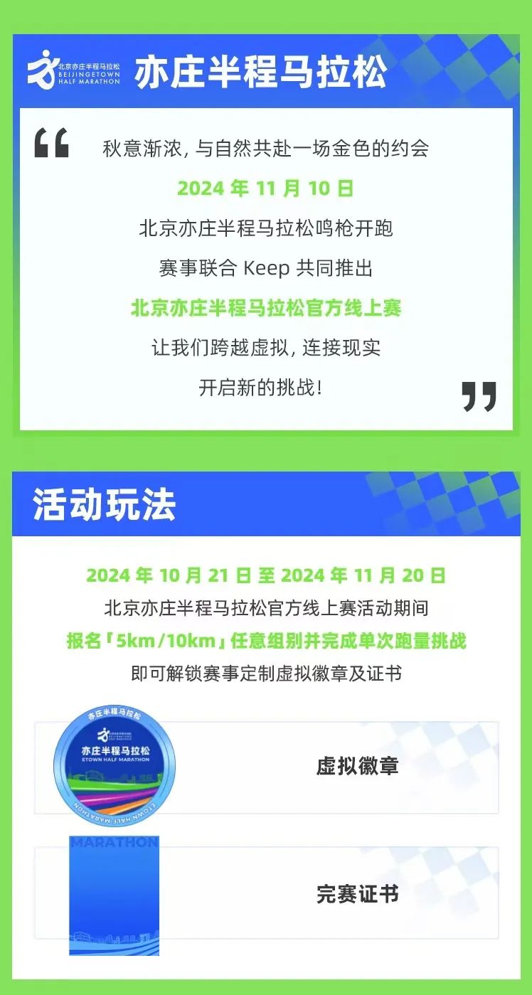 2024北京亦庄半程马拉松将于11月10日在北京亦庄激情开跑。为了让更多的跑者参与到这一赛事中,2024北京亦庄半程马拉松组委会携手在健身和运动科技领域具有广泛影响力的品牌Keep,共同为广大跑步爱好者定制了一场特别的官方线上赛。从即日起至11月20日,只要完成线上赛报名项目,即可解锁2024北京亦庄半程马拉松电子徽章及证书。这不仅是对参与者的一种激励,更是一份珍贵的纪念。