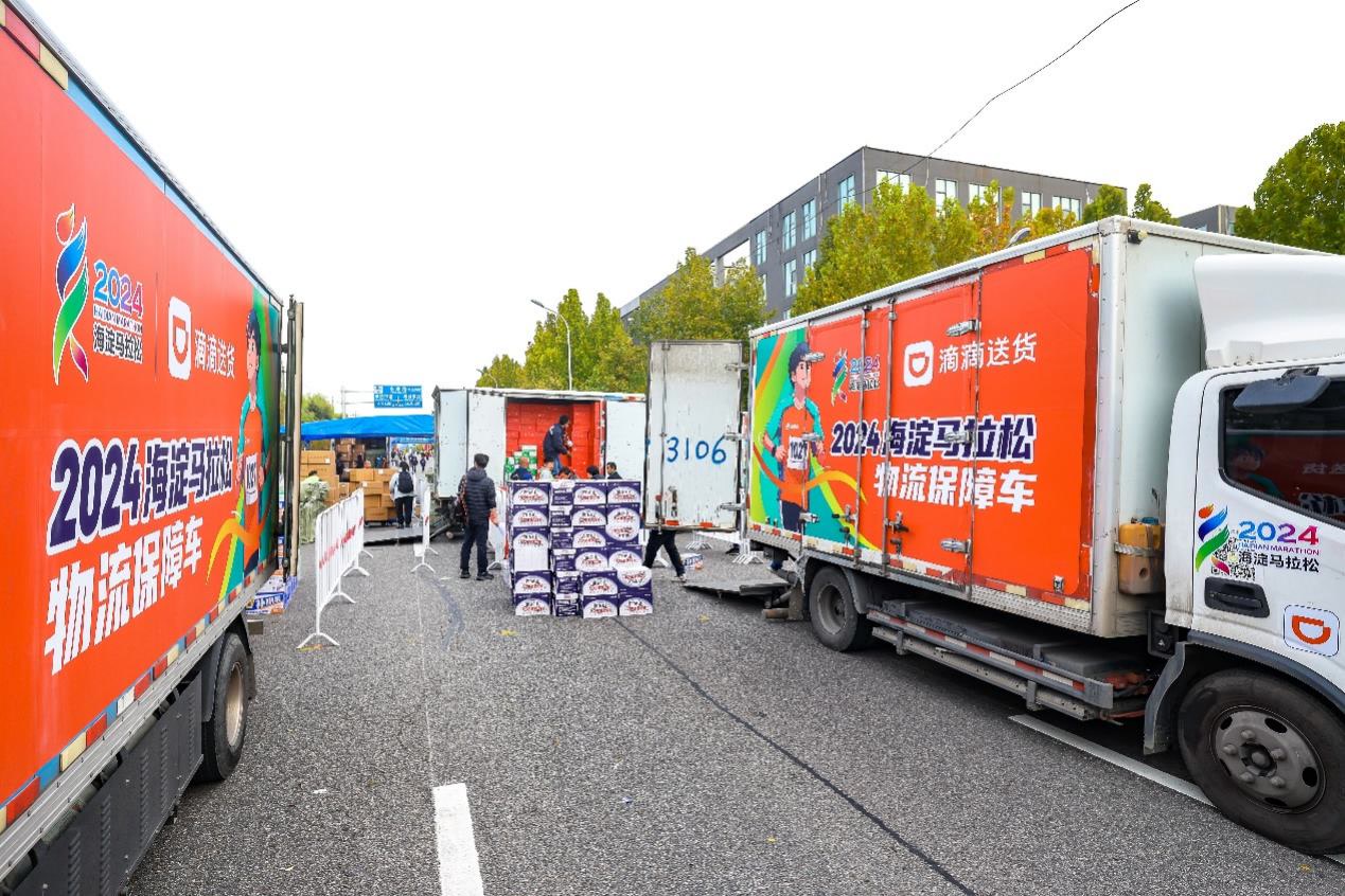 在赛事筹备期间,滴滴送货作为海淀马拉松独家物流保障车队合作商,派出50余辆次4.2米厢式货车,为赛事筹备及落地提供全程物流支持。针对上万名选手的参赛物资包,滴滴送货物流保障车提供了多站点、多批次的运输服务。在10月27日赛事当天,滴滴送货物流保障车化身为补给仓,保障各个补给站饮料、水果的充足供应,同时还有数辆应急保障车随时待命,为补给站之间的物资调拨提供机动支持。