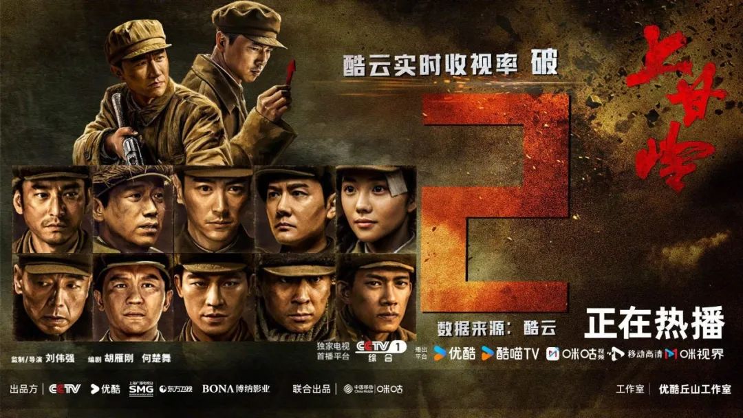 电视剧《上甘岭》由刘伟强执导,黄轩、王雷领衔主演,并汇聚了袁文康、潘斌龙、刘浩存、唐国强、冯绍峰、杜江、欧豪、释小龙等众多实力派演员。该剧通过艺术加工,再现了“特功8 连”的英雄群像,以及那段真实的历史脉络和历史场景。剧中,黄轩饰演的段显峰从军事学堂助教到志愿军战士的成长历程,王雷饰演的15军军长秦基伟的运筹帷幄, 以及众多角色所展现出的坚定不移死守阵地的毅力和一往无前冲锋陷阵的革命精神,都让观众深受感动。