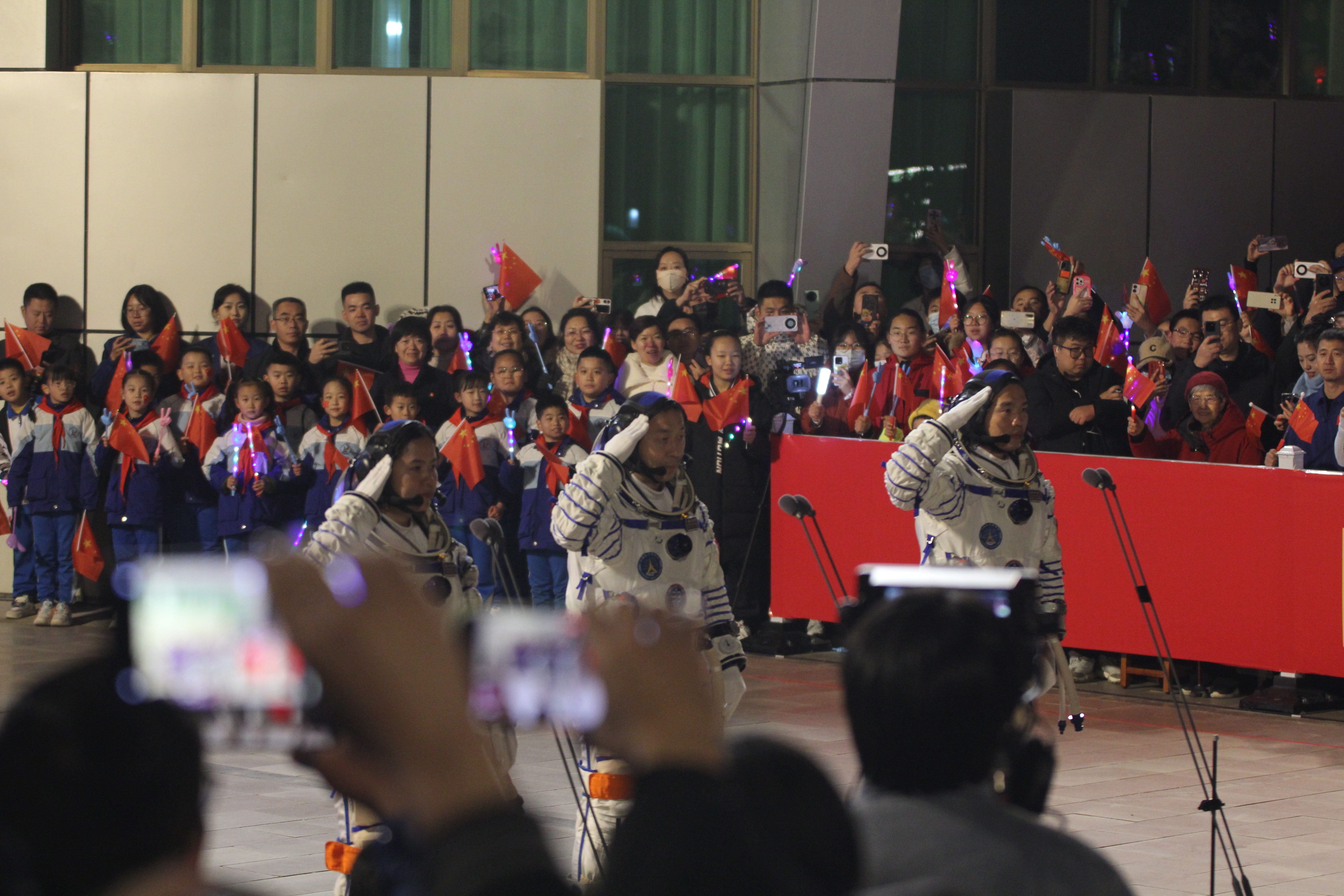 伴随着雷动的掌声和欢呼声,3名航天员走到广场中央,与中国载人航天工程总指挥、空间站应用与发展阶段飞行任务总指挥部总指挥长许学强相向而立。