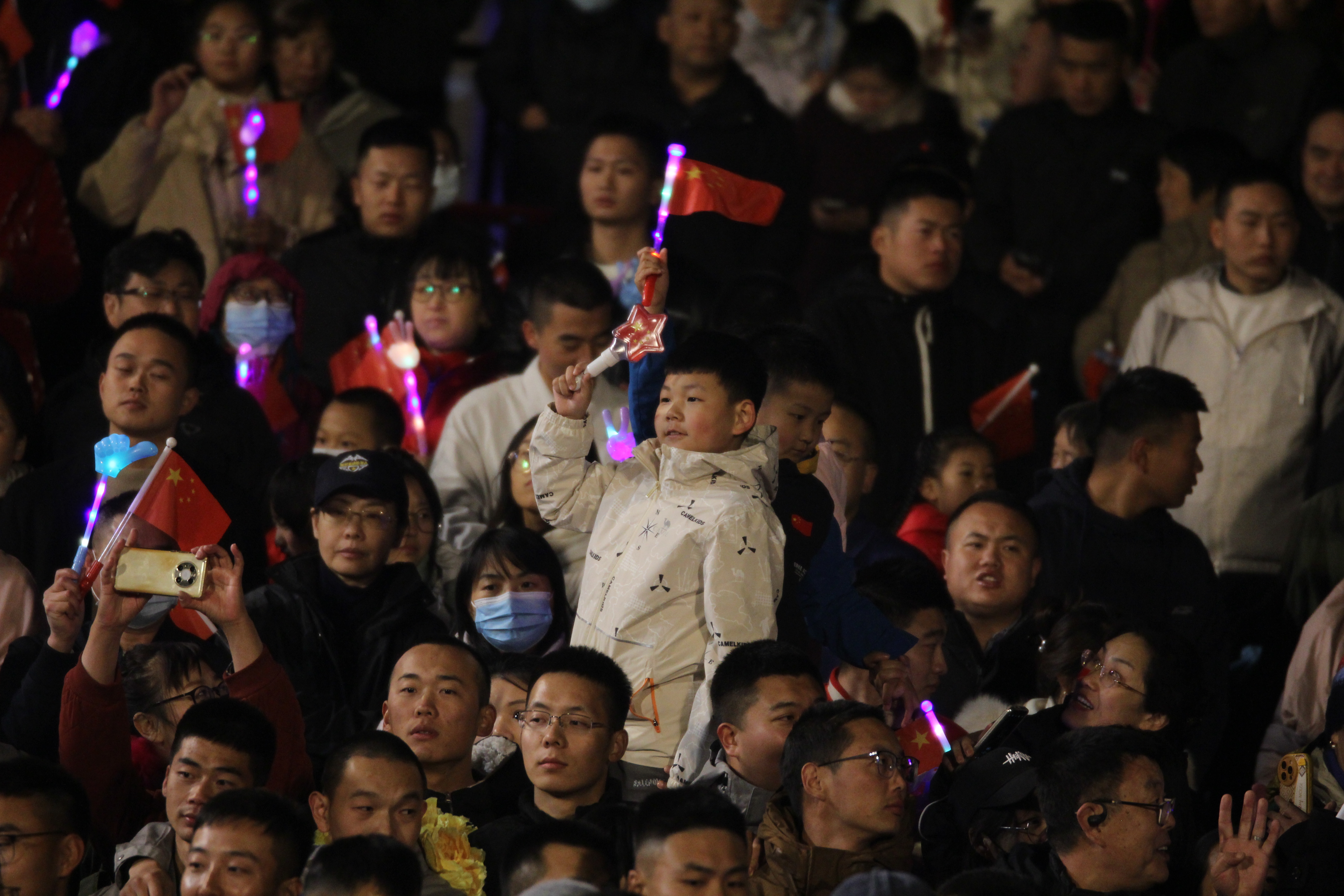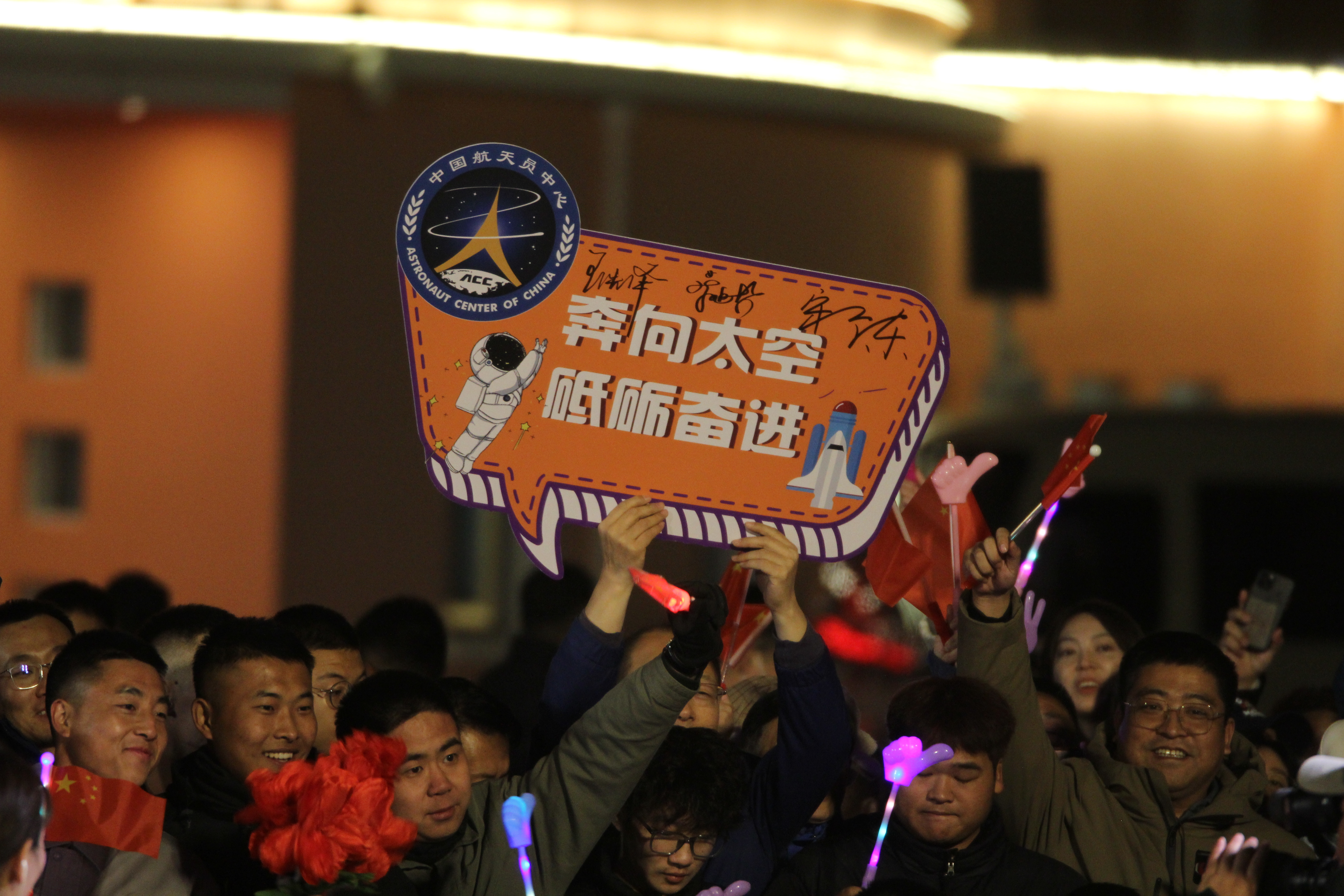 深秋,深夜,戈壁滩上寒意阵阵,在酒泉卫星发射中心问天阁外的圆梦园广场,欢送神舟十九号航天员乘组出征的航天科技工作者和群众却热情高涨。10月30日凌晨1时37分,神十九乘组航天员蔡旭哲、宋令东、王浩泽迈着稳健的步伐走出问天阁,他们即将出征太空。