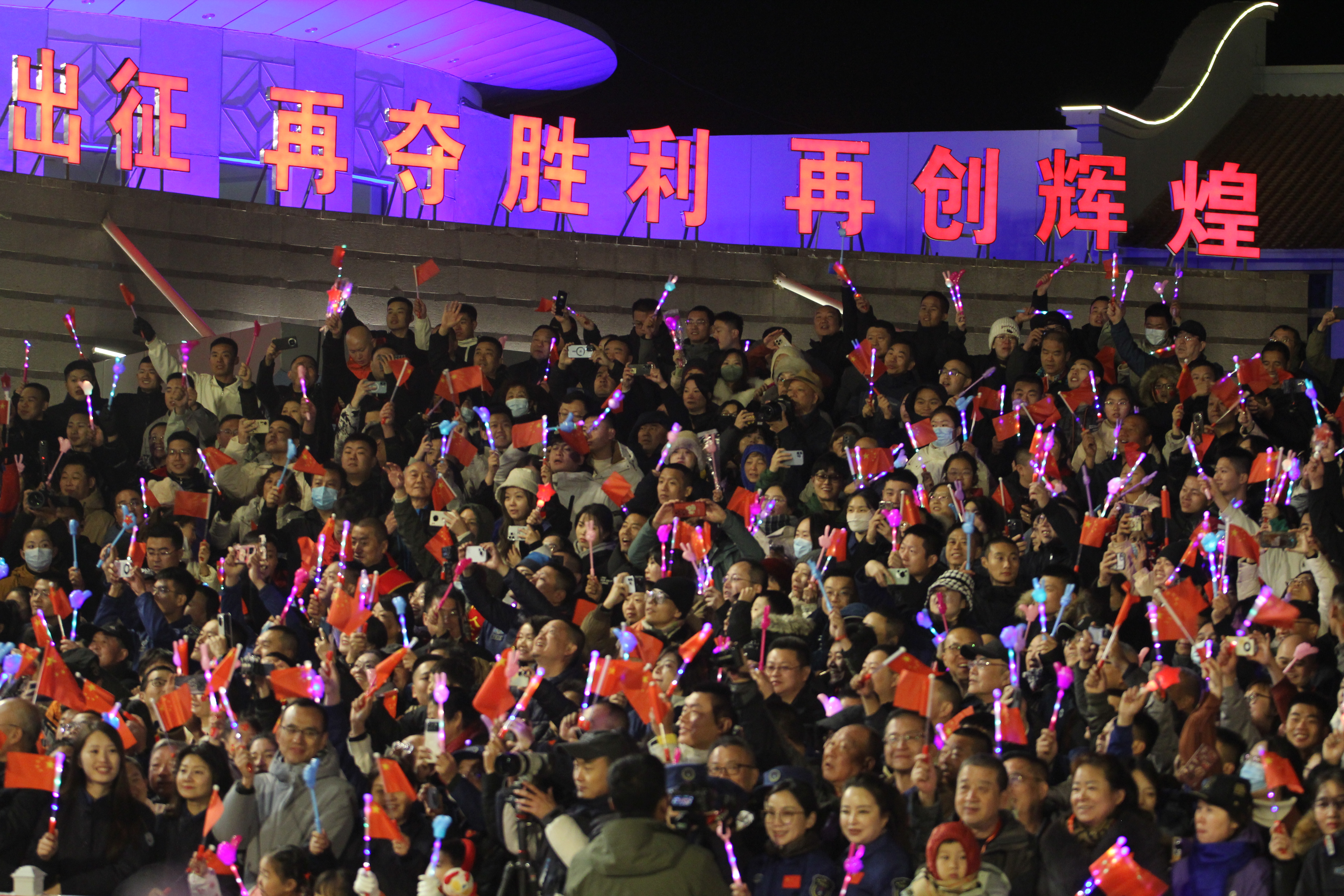 歌声、掌声、欢呼声同时响起。“向航天员学习!向航天员致敬!”“祝你们成功!等你们凯旋!”欢送队伍中,每个人都用力挥手,传递着最美好的祝愿。伴着问天阁楼顶的“再次出征,再夺胜利,再创辉煌”标语,3名航天员也回身挥手致意,随后,他们乘车前往发射区。