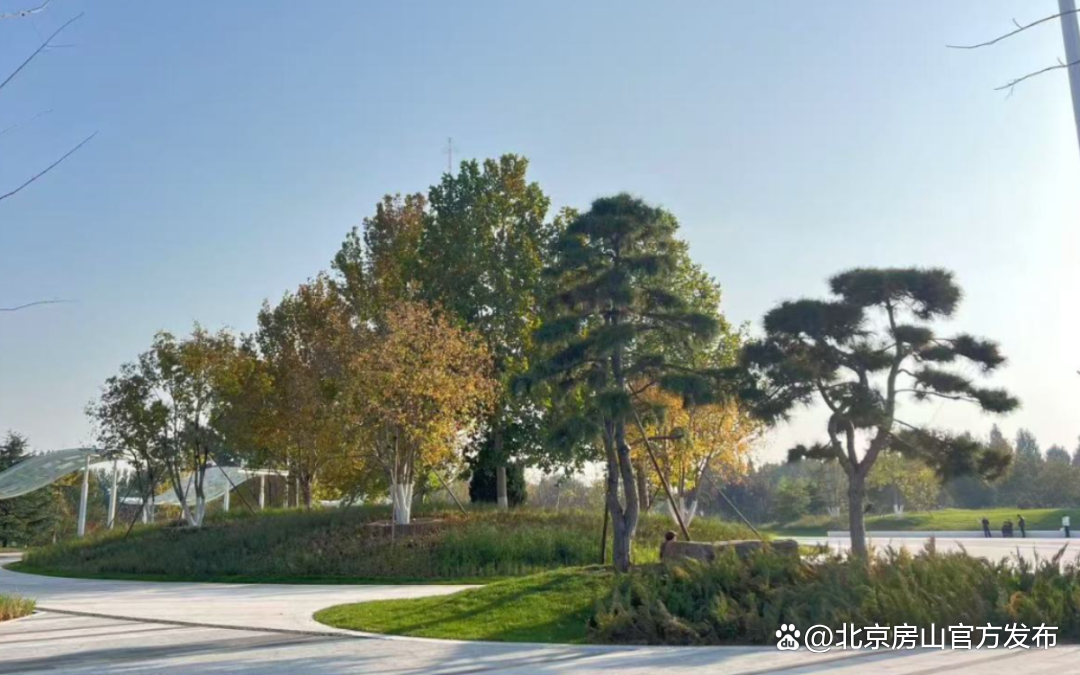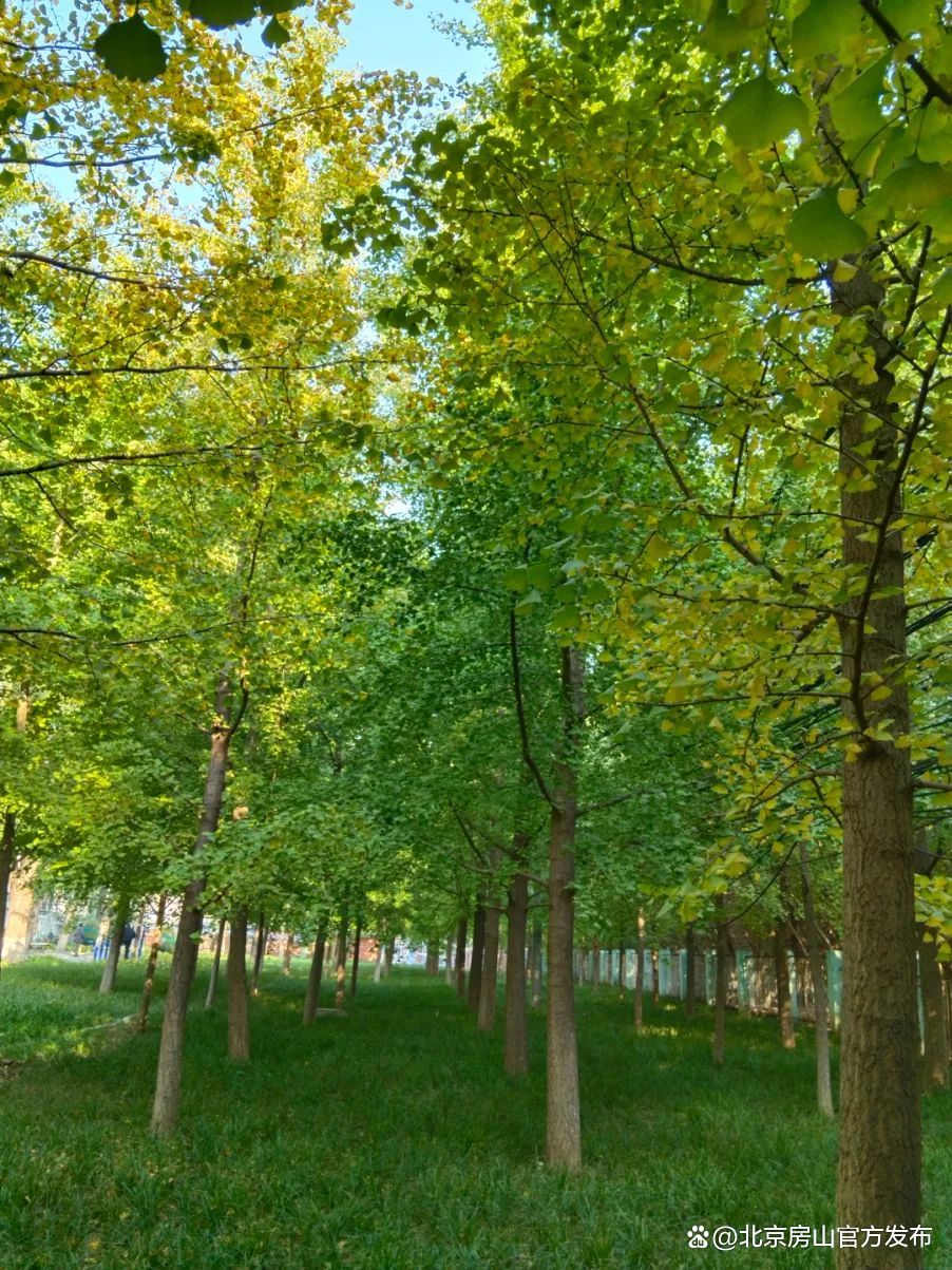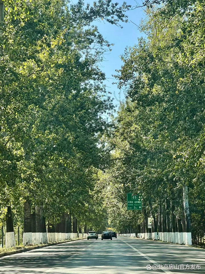 京周路大窦桥-东阎村桥道路两旁绿地整齐栽植着400余株银杏树,金秋时节,金黄金黄的银杏叶鲜艳夺目,他们用金灿灿的画面来阐述秋日浪漫。路旁高大的杨树,承载着房山人的乡愁记忆。
