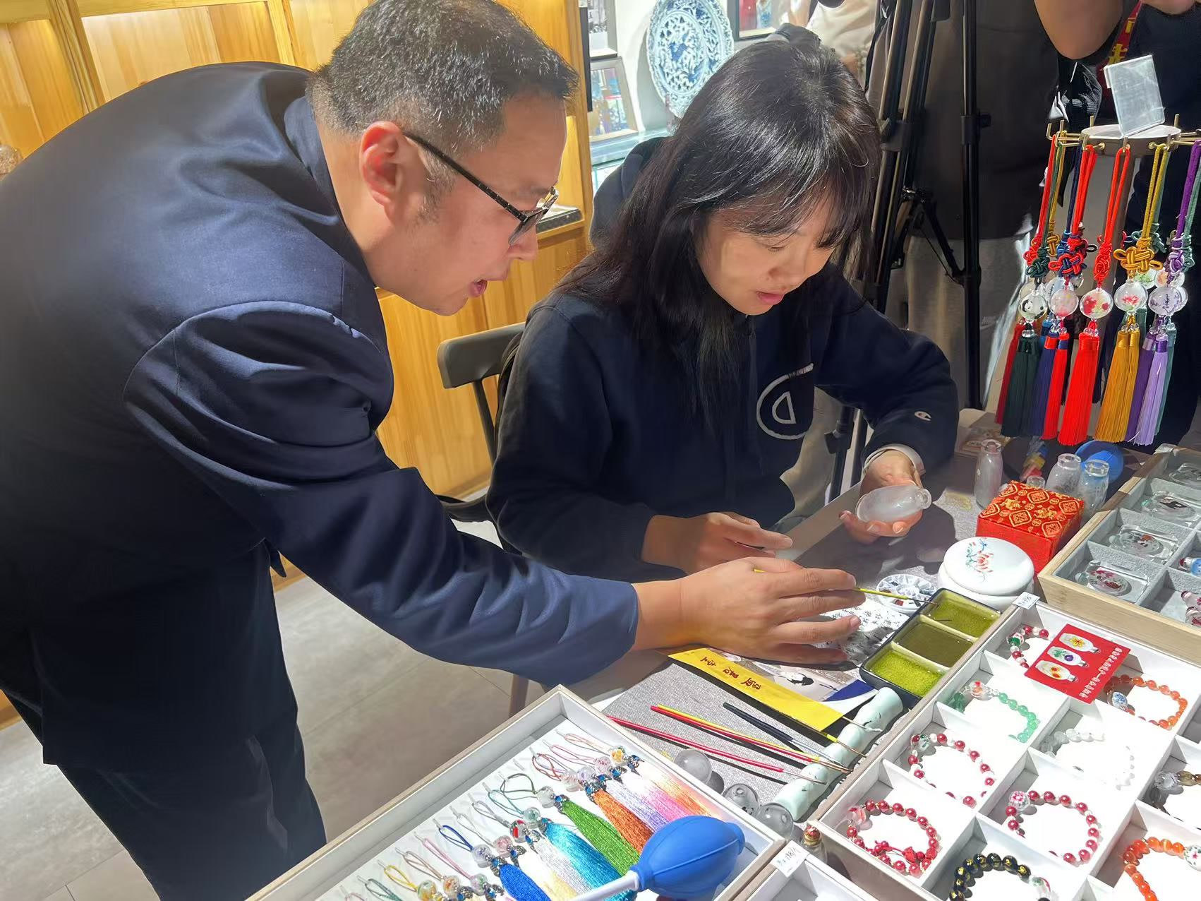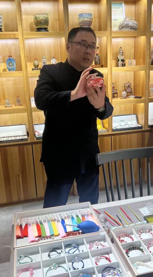 除了传统的内画鼻烟壶外,刘东的店里随处可见内画耳环、内画项链、内画手链、内画玻璃杯等与现代生活息息相关的内画技艺作品。“现在很多人都喜欢买材料包,用简单的材料自己制作手工制品。所以我们也特别设计了内画制品材料包,新手在短时间内就能绘制出一件专属自己的内画作品。”记者了解到,红桥市场已打造了本市第一个“非遗传播孵化园”,将刺绣、景泰蓝、雕漆等非遗大师请进园内落户,通过不断创新,对外传播中国优秀传统文化。