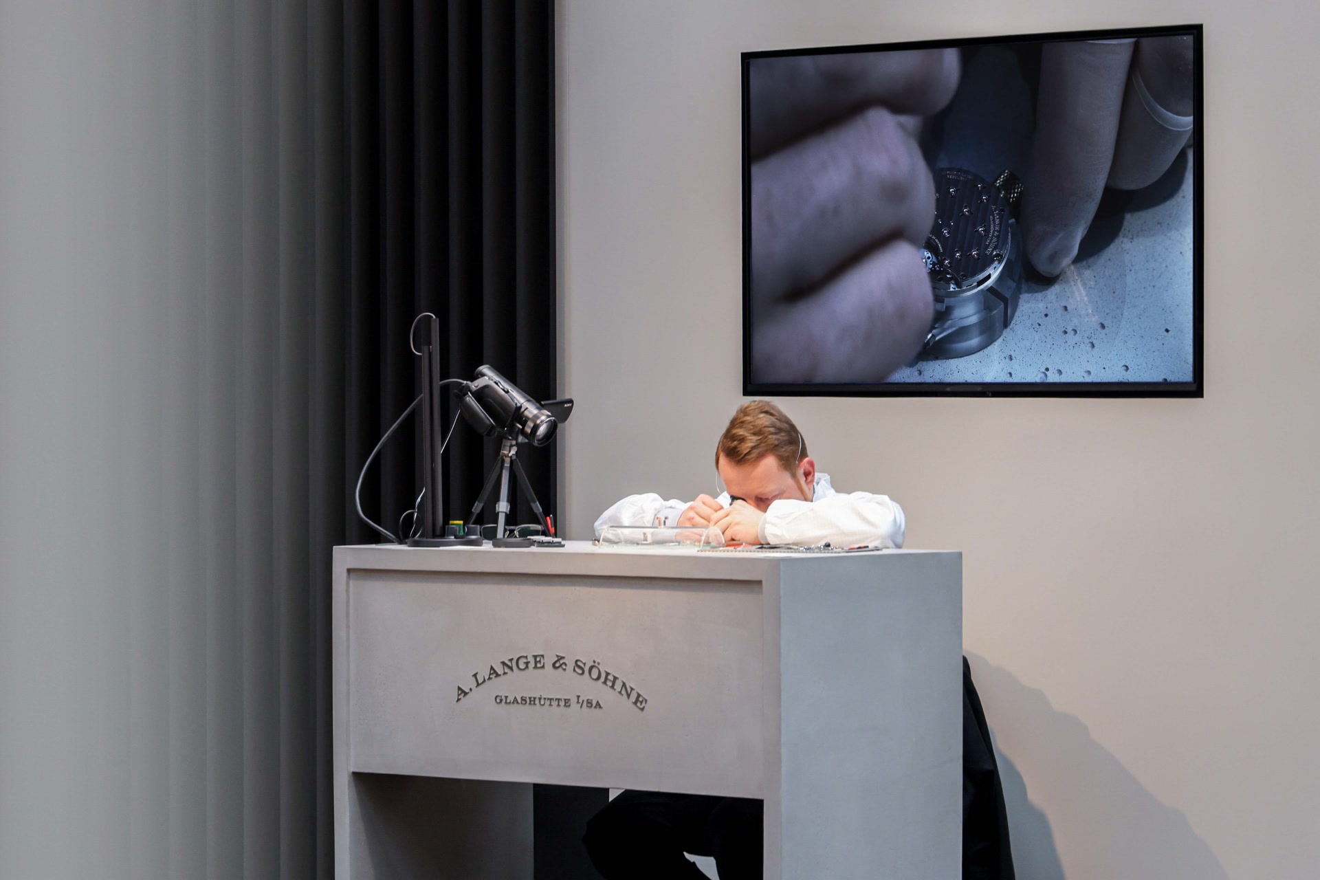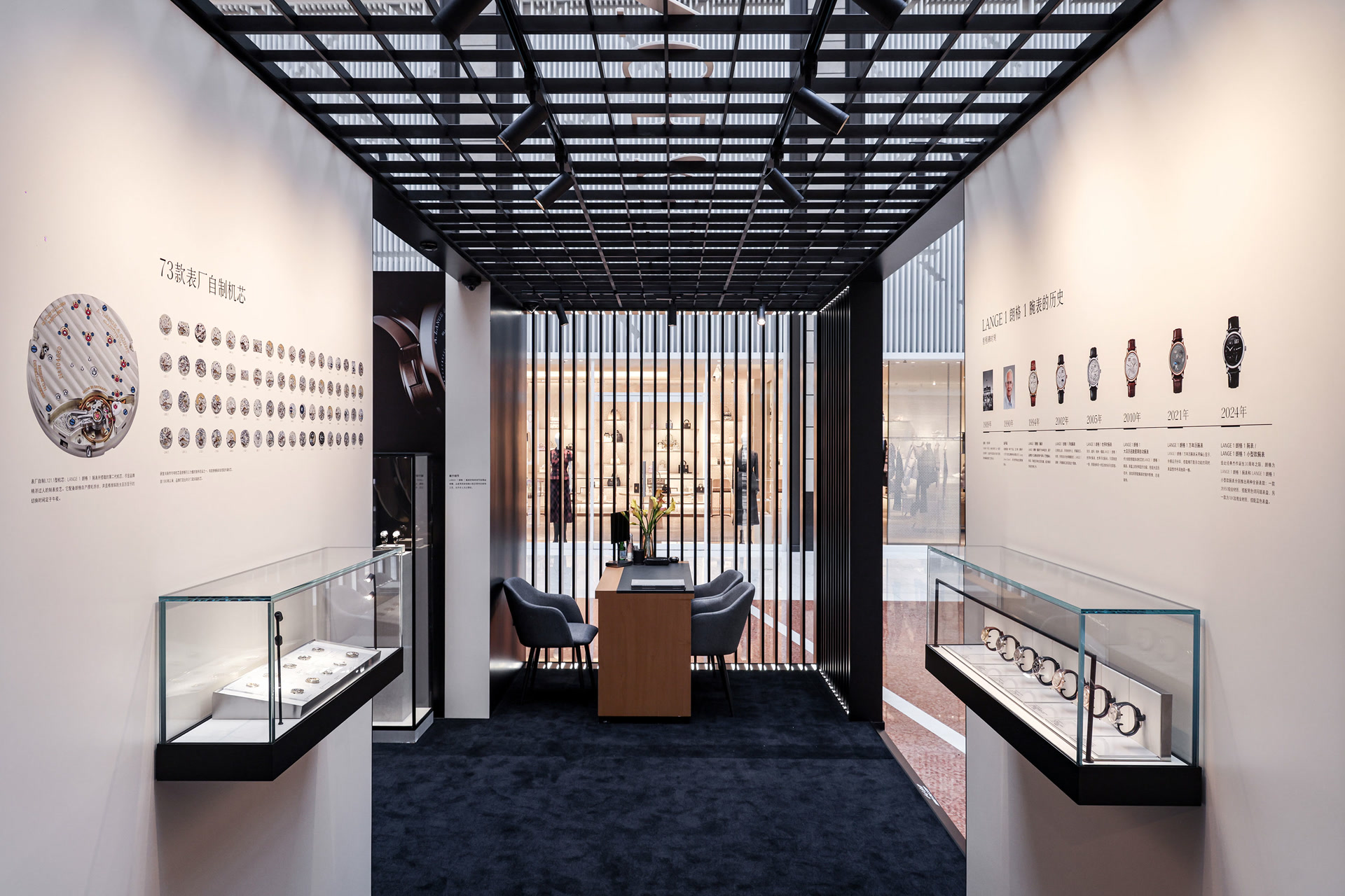 历史墙的正对面,展示的是朗格在技术研发上致力于追求卓越的决心。每一款腕表,朗格均会为其打造机芯,至今已有73款表厂自制机芯。此处展示了其中运用于LANGE 1系列的10款机芯,其中包含手动上链、自动上链、配备月相、世界时、万年历以及夜光显示等不同功能的机芯,不同功能的机芯有着不同的机械结构,但每一款机芯均可见朗格从怀表时代传承至今的传统元素,诸如由未经处理的德国银制作的四分之三夹板、蓝钢螺丝固定黄金套筒,以及手工雕刻摆轮夹板等等。展厅现场亦设有制表师工作台,观者可悉心观赏来自萨克森制表厂的精密制表工艺,亲身体验制表师的匠心独运,深入了解每一枚腕表背后的故事与技艺,感受传统与未来在腕间交织的奇妙体验。
