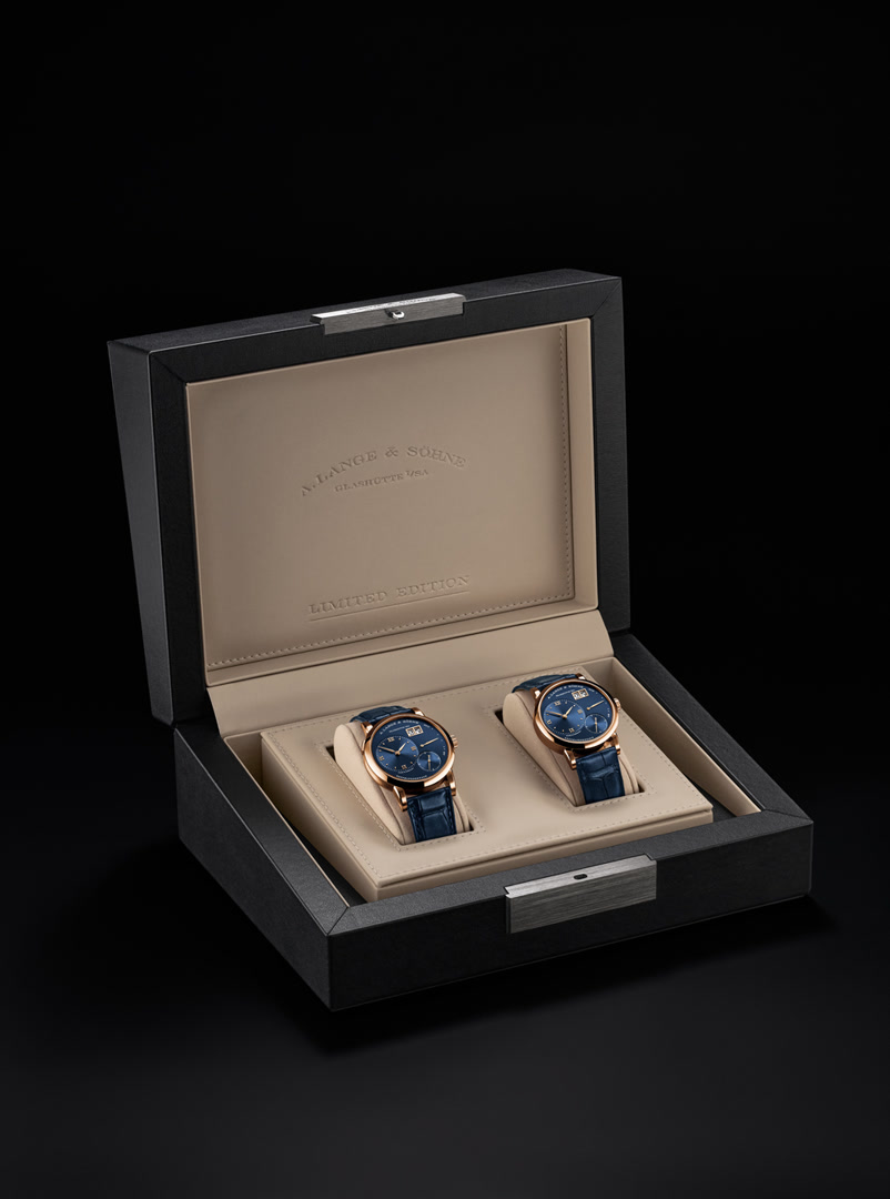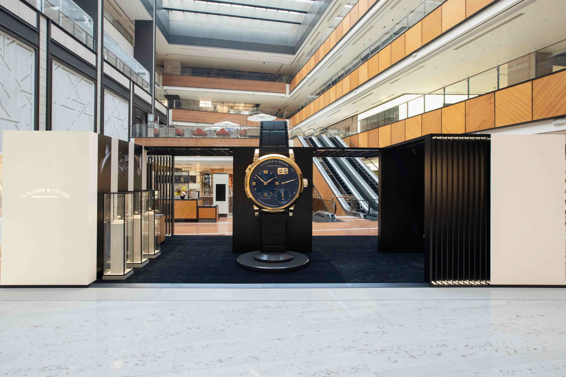 步入展厅,首先可见中央一座以新款LANGE 1腕表750玫瑰金款为原型而打造的巨型腕表装置。该装置高为3.3米,将LANGE 1腕表的偏心表盘布局、大日历视窗等特点一览无遗地展示出来,全新的蓝色盘面配以玫瑰金表壳的材质组合,更是呈现出别样的LANGE 1之美。此次朗格为致敬30周年发布的4款新款限量版腕表:LANGE 1腕表和LANGE 1小型款腕表分别配备铂金950表壳搭配黑色缟玛瑙材质的表盘,750玫瑰金款搭配蓝色925银质表盘,均搭载表厂自制L121.1型机芯,提供72小时动力储存。