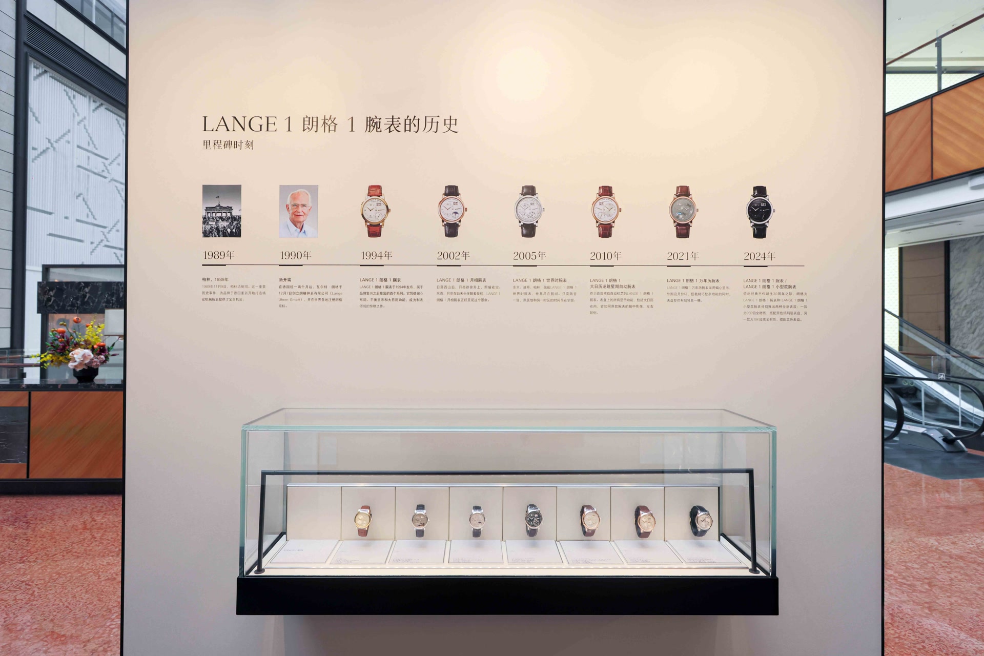 展厅深处,一面记录着LANGE 1发展史的历史墙与7款LANGE 1腕表的经典表款映入眼帘。不仅有1994年的第一枚LANGE 1腕表18K黄金款,还有配备夜光显示的LANGE 1大型款“Luminous”腕表18K白金款和2019年发布的LANGE 1 “25周年纪念”18K白金款。此外,展厅还将品牌于2014年为致敬20周年推出的LANGE 1 “20周年纪念款”的三款对表展示给参观者,实属珍罕。