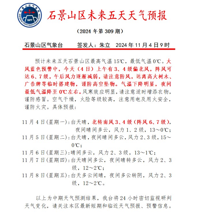 11月4日(星期一):白天晴,北转南风3、4级(阵风6、7级),夜间晴间多云,风力1、2级,13~0℃。