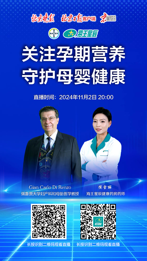 为解答大家常见的疑问,11月2日,“健康养生大讲堂·关注孕期营养 守护母婴健康”主题科普讲座于北京日报客户端京直播播出,邀请意大利佩鲁贾大学妇产科和母胎医学教授Gian Carlo Di Renzo与海王星辰健康药房药师侯雪丽,从备孕、孕早期、孕中晚期、哺乳期四个阶段给出营养补充、体重控制等实用性强的建议,并针对双胎妊娠、超重及肥胖等特殊情况,进行深入探讨和知识分享。