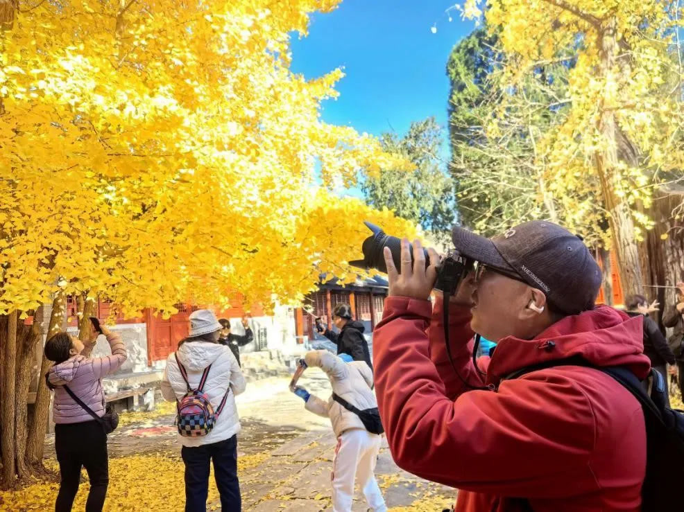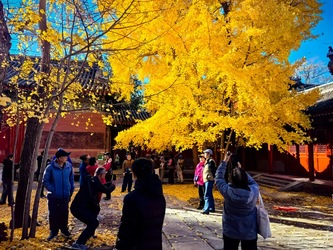 昨天的一场秋风加快了银杏叶的飘落,但是依然没能阻挡大家对承恩寺的向往!今天是承恩寺赏秋限时开放活动的第一天,很多游客赶在开门第一时间排队入场,迫不及待欣赏这神秘寺庙的金秋时刻!