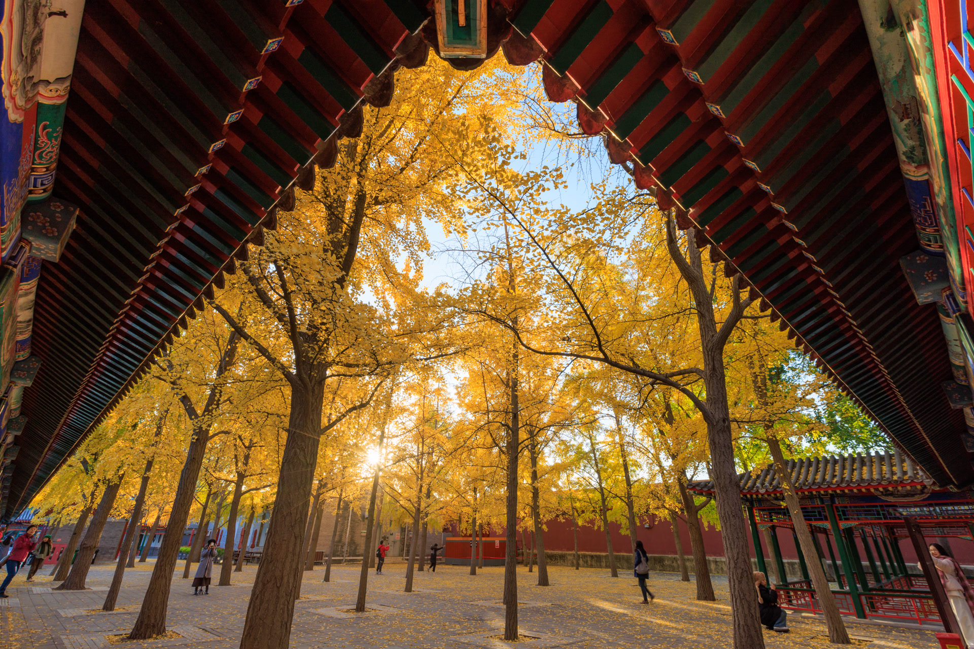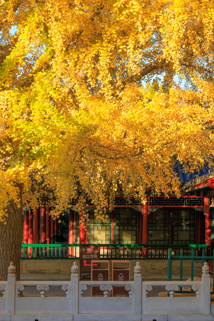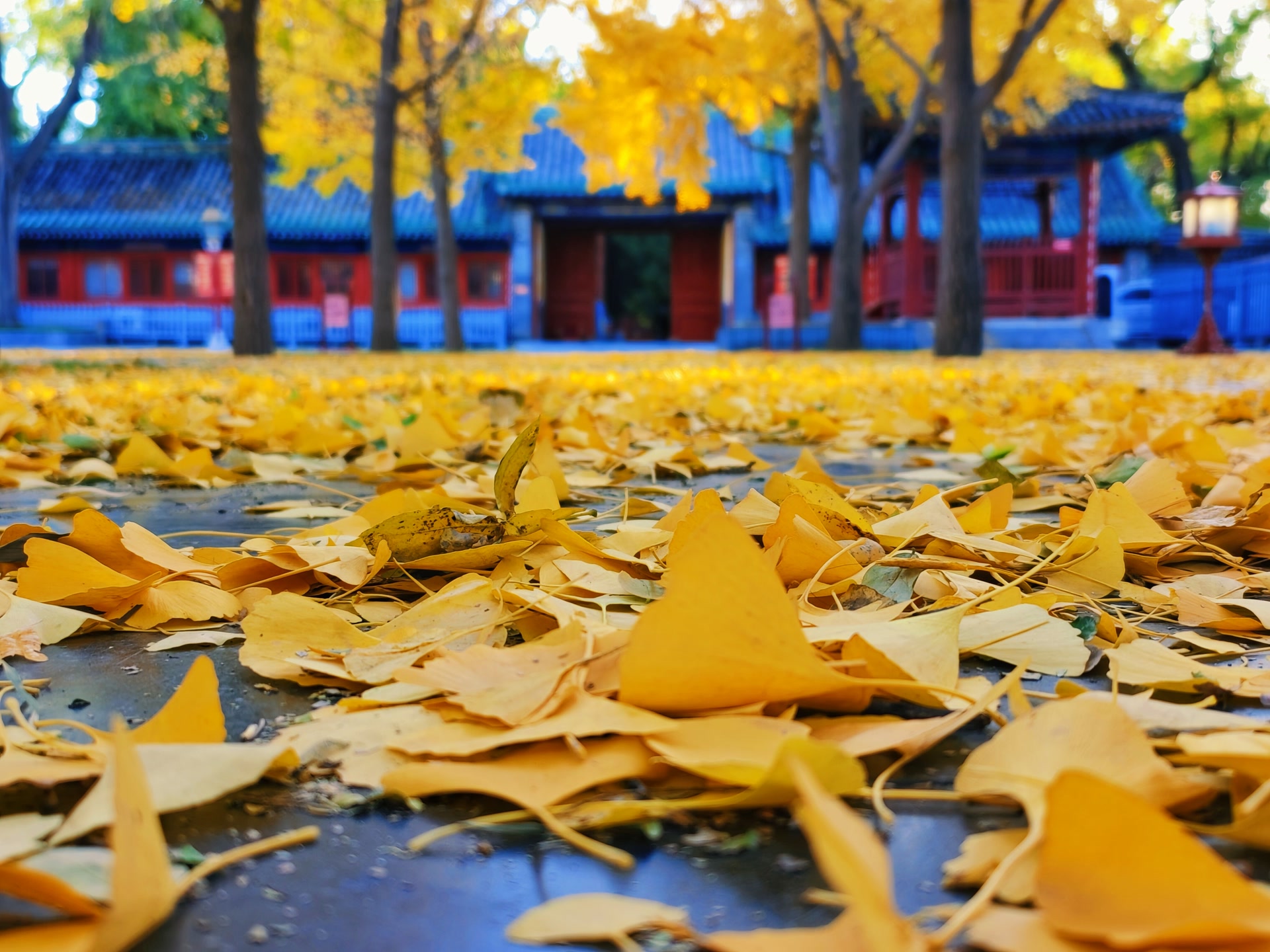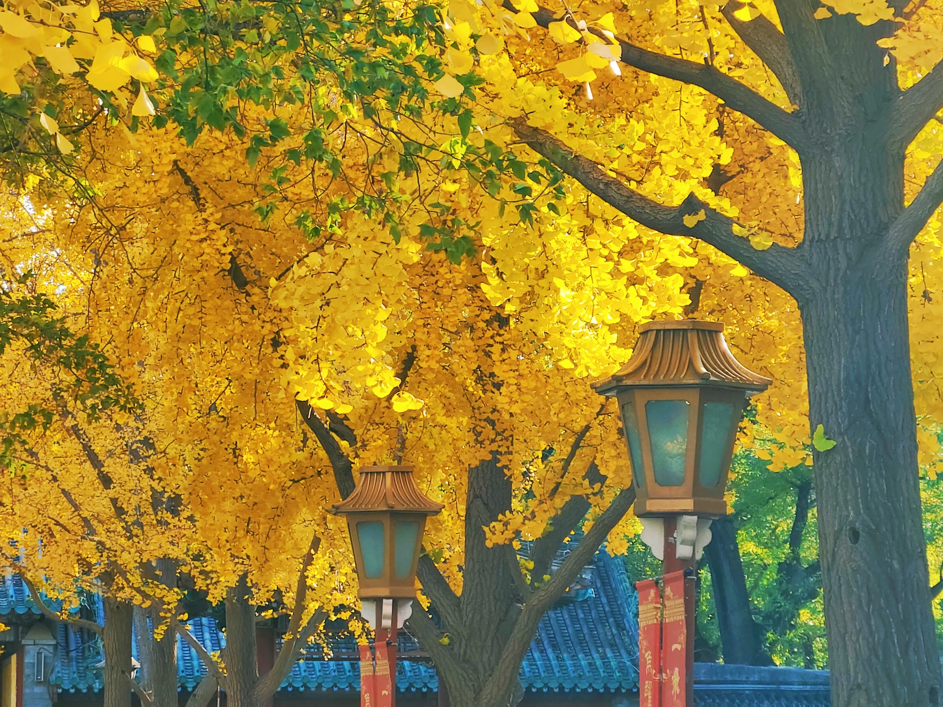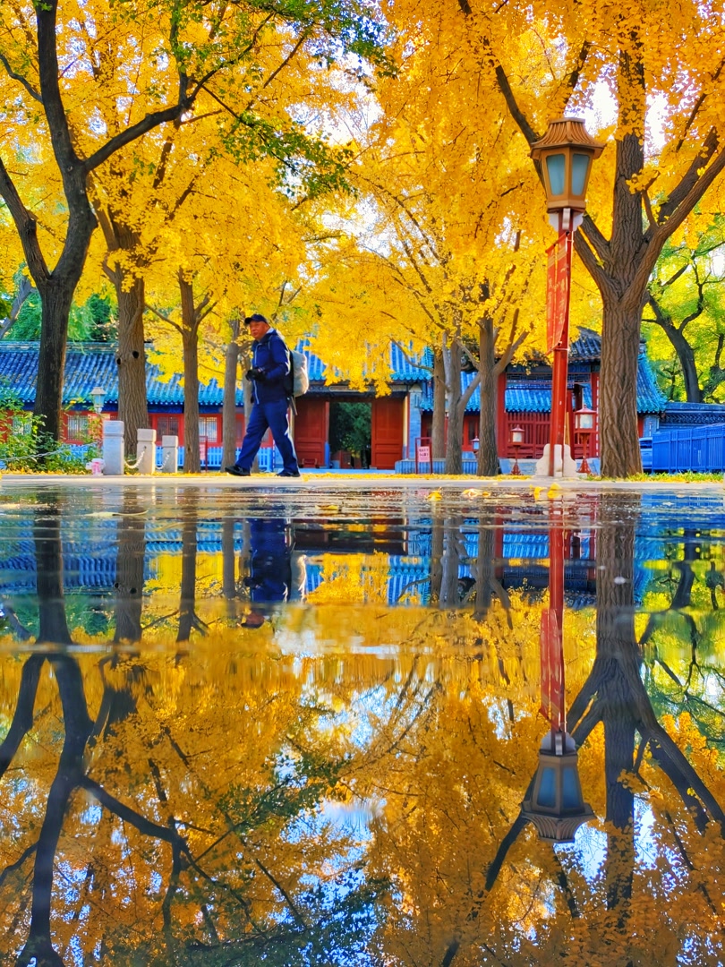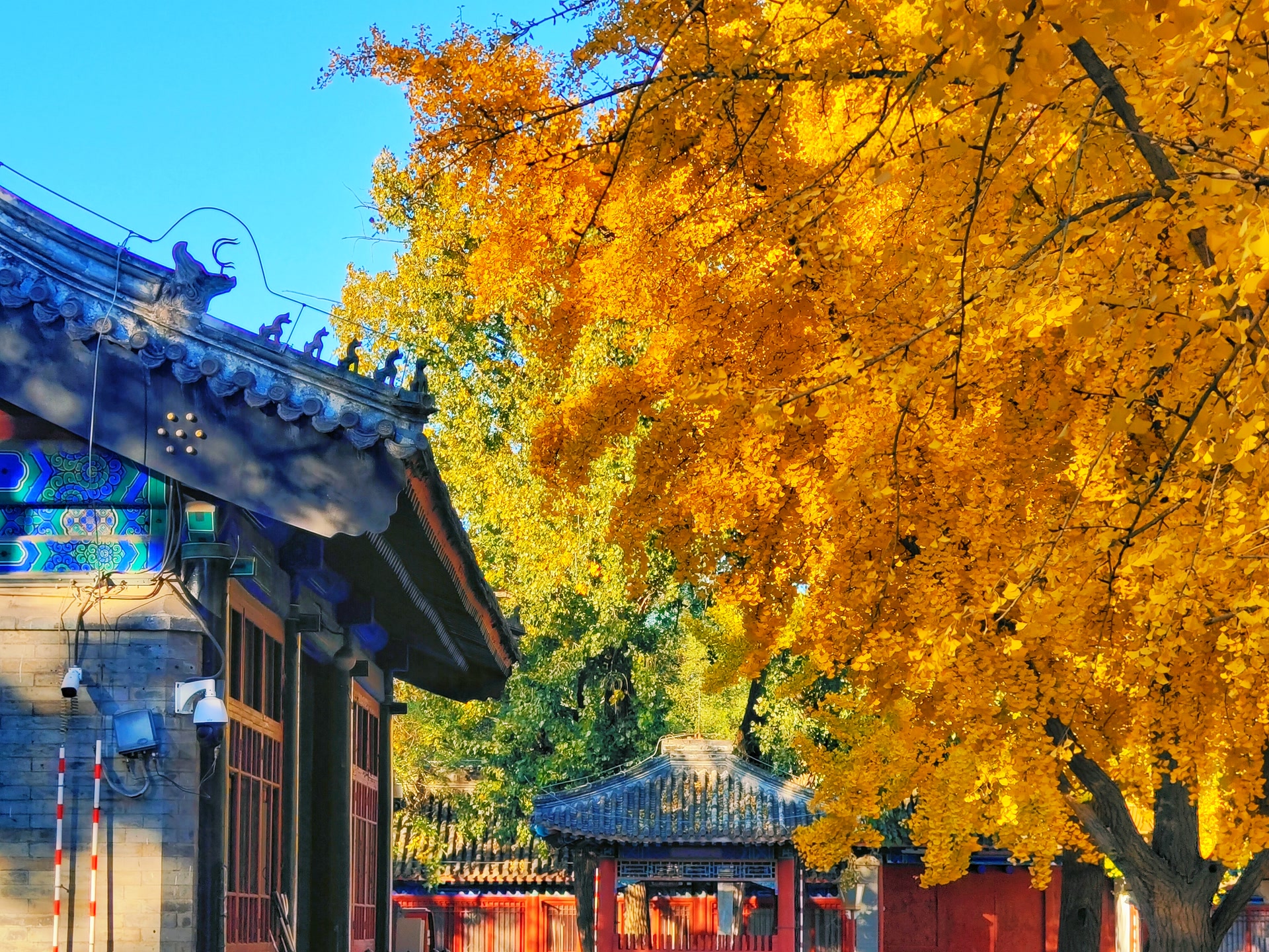 中山公园、孔庙和国子监博物馆,秋色正浓。银杏叶金黄璀璨,点缀在古建筑间,与青砖灰瓦交相辉映,美不胜收。
