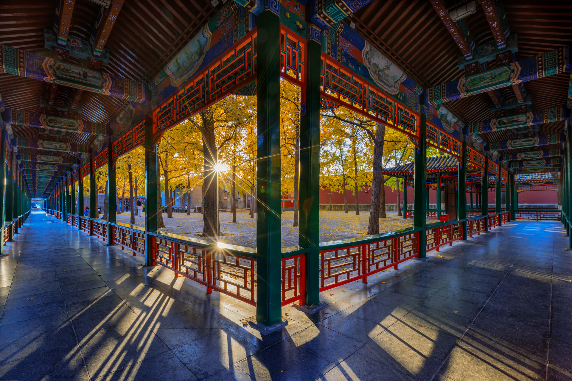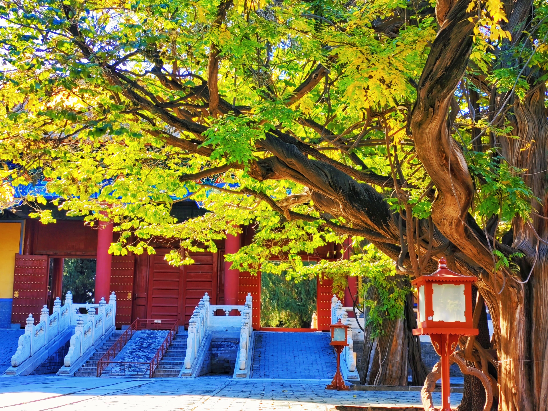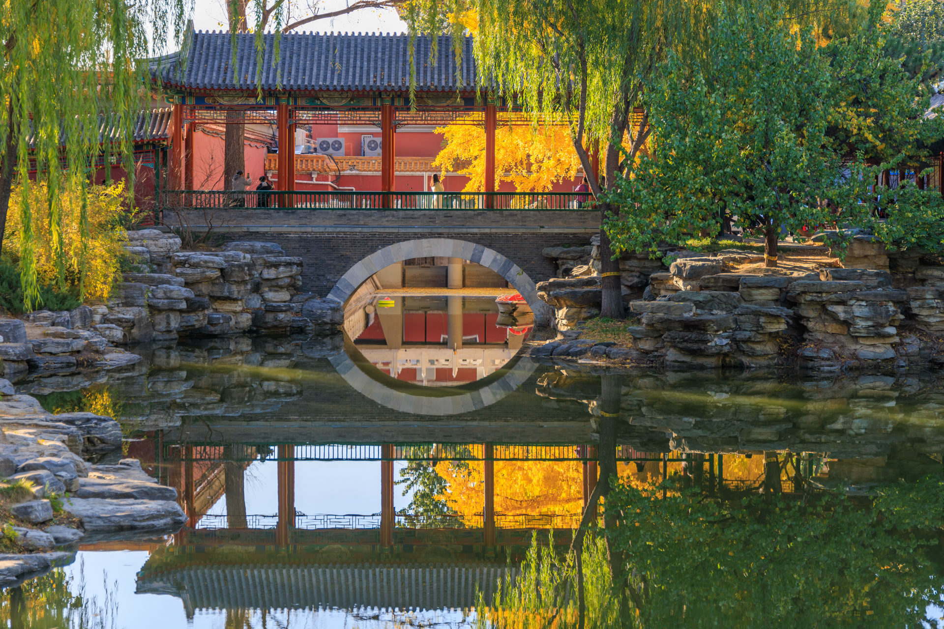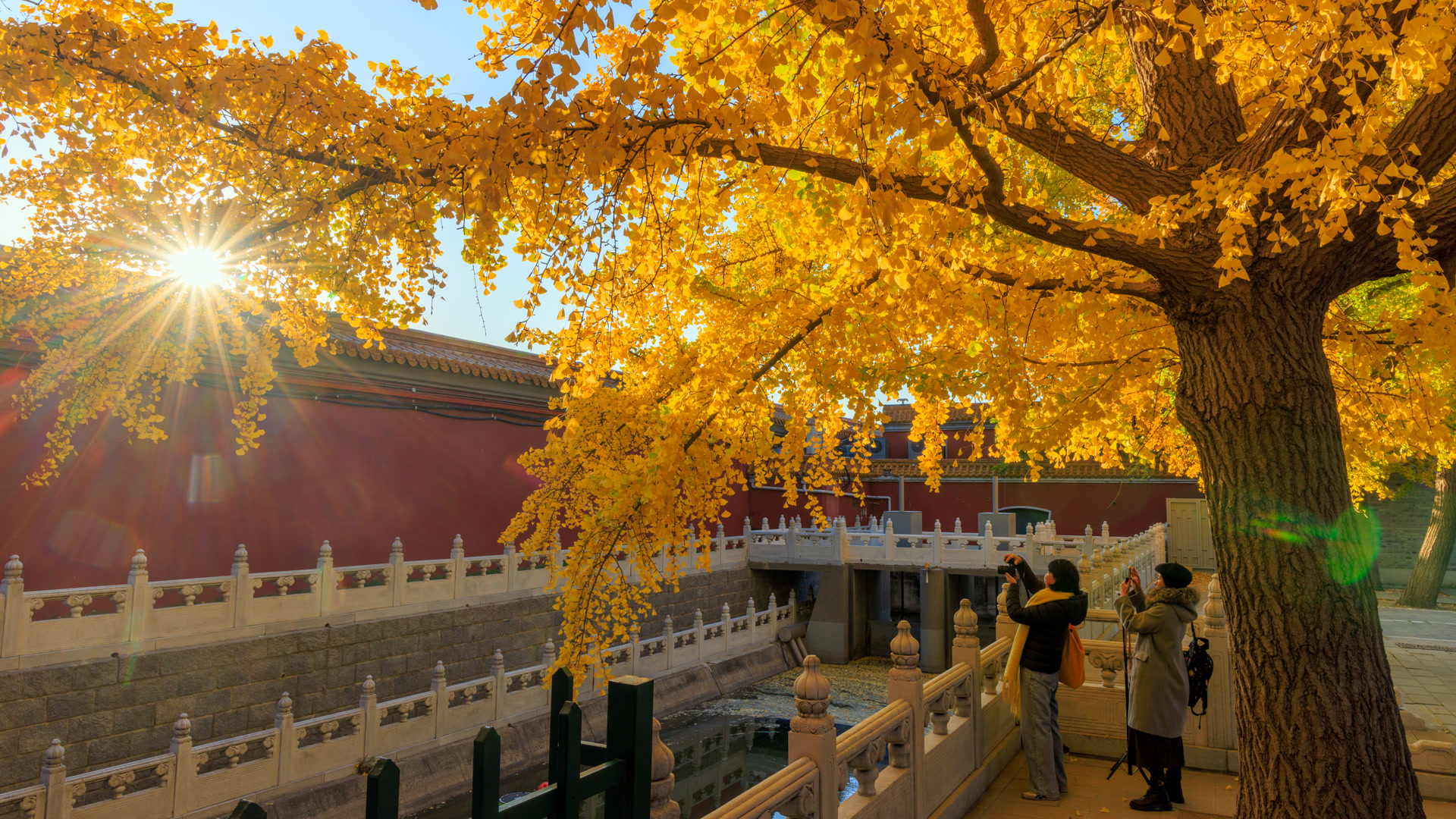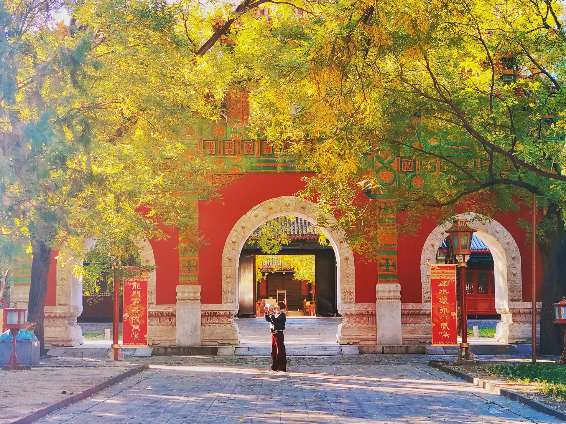 中山公园、孔庙和国子监博物馆,秋色正浓。银杏叶金黄璀璨,点缀在古建筑间,与青砖灰瓦交相辉映,美不胜收。